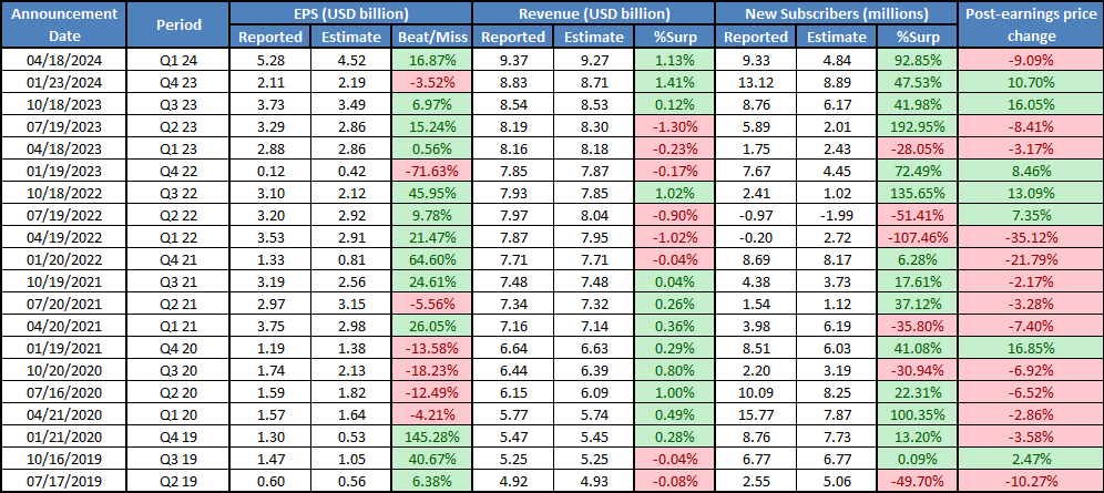 Comunicările privind câștigurile Netflix tind să declanșeze reacții mari pe piață. Reacțiile pieței la cele 20 de comunicate trimestriale anterioare au fost prezentate în tabelul de mai jos. După cum se poate observa, nu a existat întotdeauna o legătură clară între depășirea/lipsa vânzărilor, câștigurilor și abonaților și reacția pieței. Netflix a înregistrat rezultate foarte bune în ceea ce privește câștigurile și abonații în Q1 2024, dar acțiunile au scăzut cu peste 9% în timpul sesiunii de după câștiguri, deoarece compania a anunțat că nu va mai publica date privind abonații.