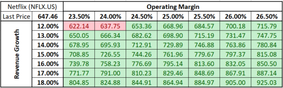 Să aruncăm o privire rapidă asupra evaluării Netflix cu două metode de evaluare des utilizate - DCF și multipli. Deoarece Netflix nu este o acțiune care plătește dividende, aceasta nu poate fi evaluată cu modelul de creștere Gordon, pe care îl folosim adesea în analiza noastră cu Acțiunea săptămânii . Dorim să subliniem faptul că aceste evaluări sunt doar în scop de prezentare și nu trebuie considerate recomandări sau prețuri țintă.