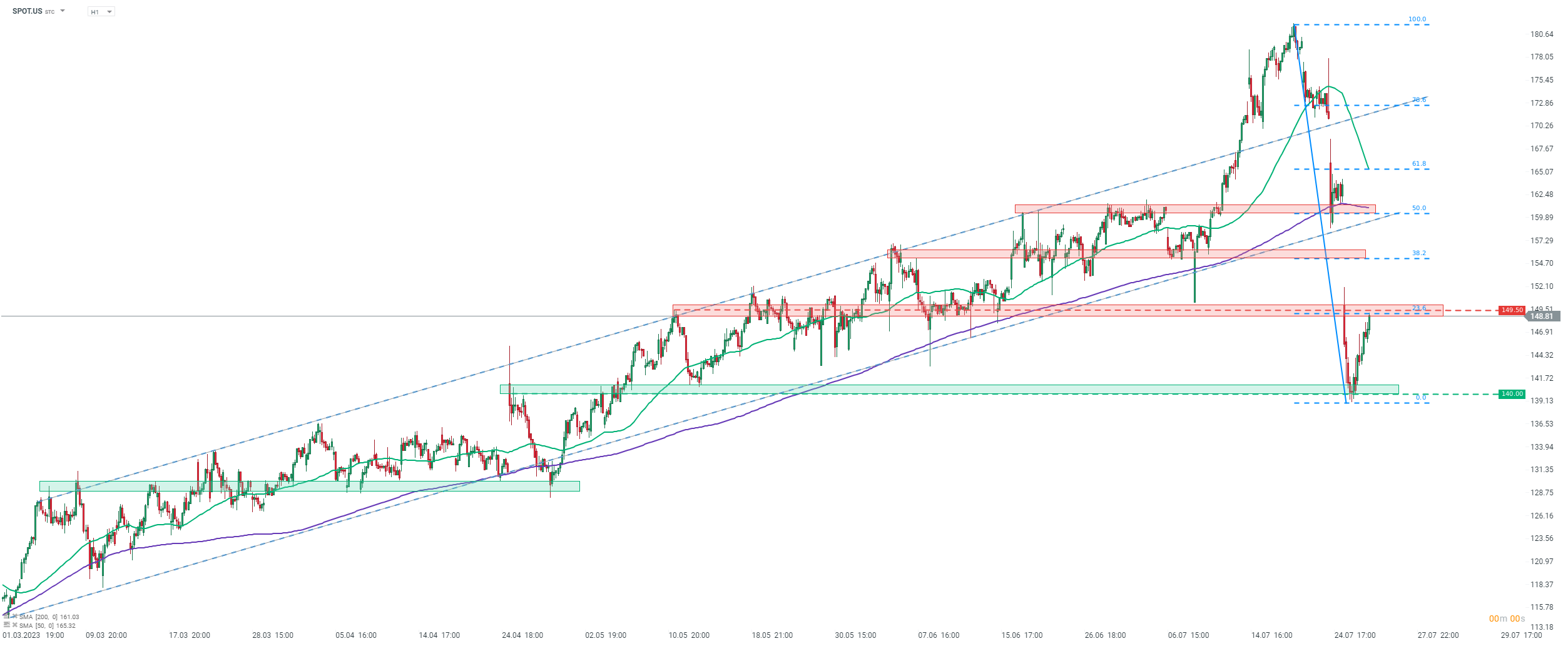 Aruncând o privire la graficul Spotify Technologies (SPOT.US) pe intervalul H1, putem observa că acțiunile au depășit recent limita superioară a canalului de creștere, dar taurii nu au reușit să mențină impulsul și acțiunile au început să se retragă în urma știrii privind creșterea prețurilor. Prețul acțiunilor s-a retras în intervalul canalului și s-a prăbușit mai târziu sub acesta. Scăderile au fost oprite în zona de 140 de dolari, iar acțiunile au început să recupereze din pierderi. Câștigurile au fost oprite la retragerea Fibonacci de 23,6% a vânzării în zona de 149,50 dolari, dar cotațiile actuale din premarket indică o deschidere peste pragul de 151,00 dolari astăzi. Acestea fiind spuse, zona de 149,50 dolari menționată mai sus va acționa ca suport pe termen scurt, în timp ce zona de 155 dolari, marcată cu retragerea Fibonacci de 38,2%, va acționa ca rezistență pe termen scurt.