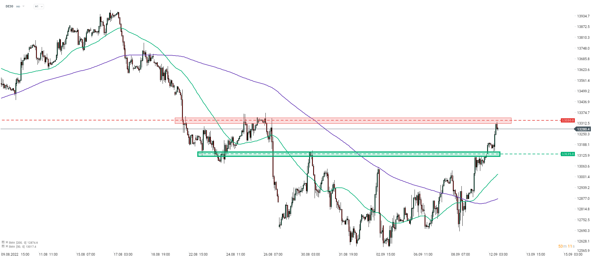 DE30 avansează cu 1,5% astăzi. Indicele a ajuns la rezistența de la 13.330 puncte, dar prima încercare de spargere în sus a fost una eșuată. Sursa: xStation5