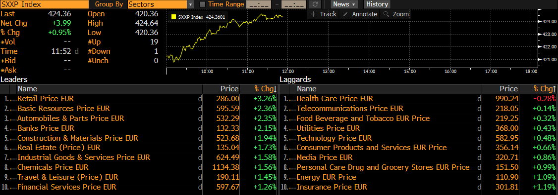 Acțiunile ciclice stimulează creșterea de astăzi a indicelui Euro Stoxx 600. Sursa: Bloomberg