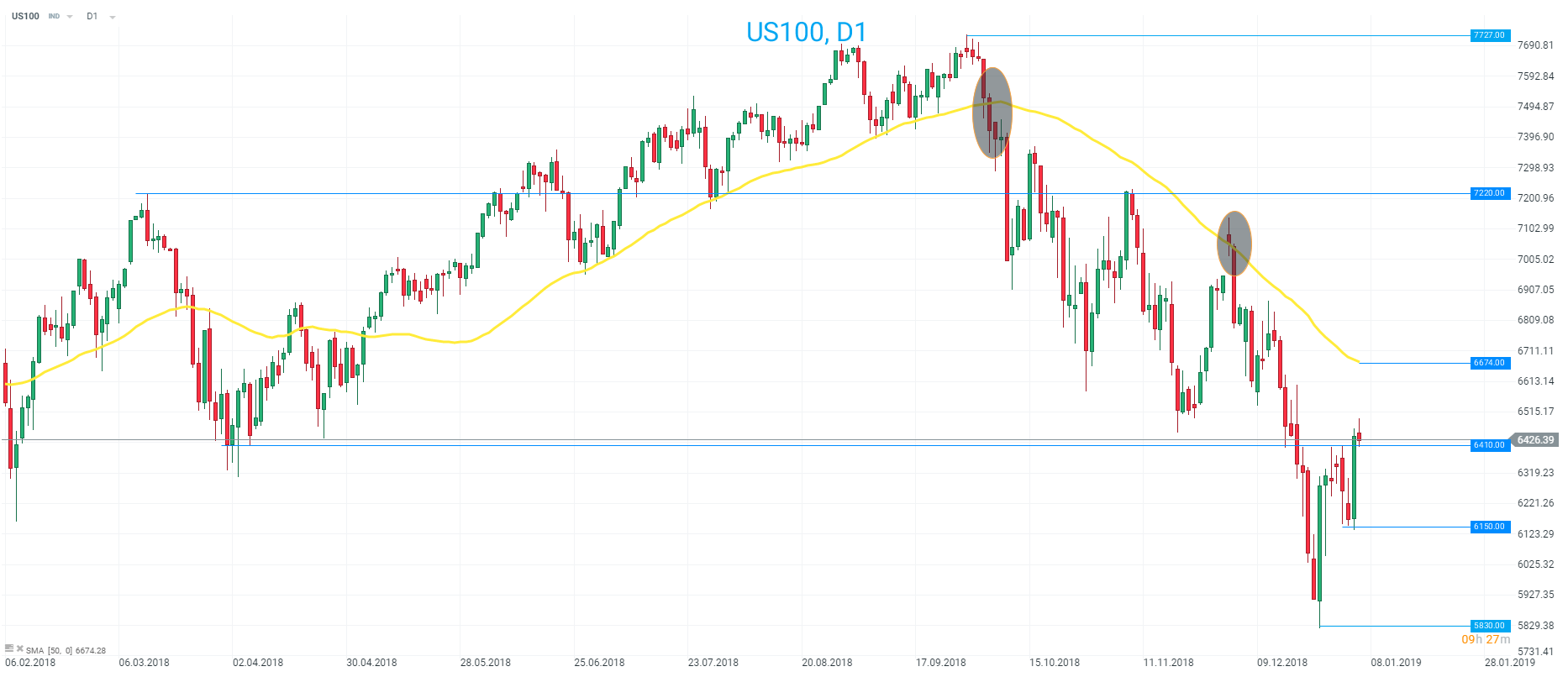 După raliul impresionant de săptămâna trecută, indicii din SUA stagnează astăzi, traderii îndreptându-și atenția asupra sesiunii cash. Discursul dovish a lui Jerome Powell, în care președintele Fed a susținut pentru prima dată acțiunile din Q3, a fost catalizatorul unei mișcări ascendente iar lumânarea D1 de astăzi a ”înghițit” suprafața lumânărilor din ultimele patru sesiuni într-o manieră bullish. Astfel, US100 a reușit să avanseze, închizând deasupra pragului de 6410 de dolari, situație ce poate fi considerată pozitivă, piața depășind o barieră pe termen scurt. Acest nivel ar putea reprezenta prima zonă de suport, urmat de 6150. Astfel, rezistența pe termen scurt pare să fi avansat, iar media mobilă de 50 de perioade de la 6674 ar putea reprezenta o țintă pentru cumpărători.