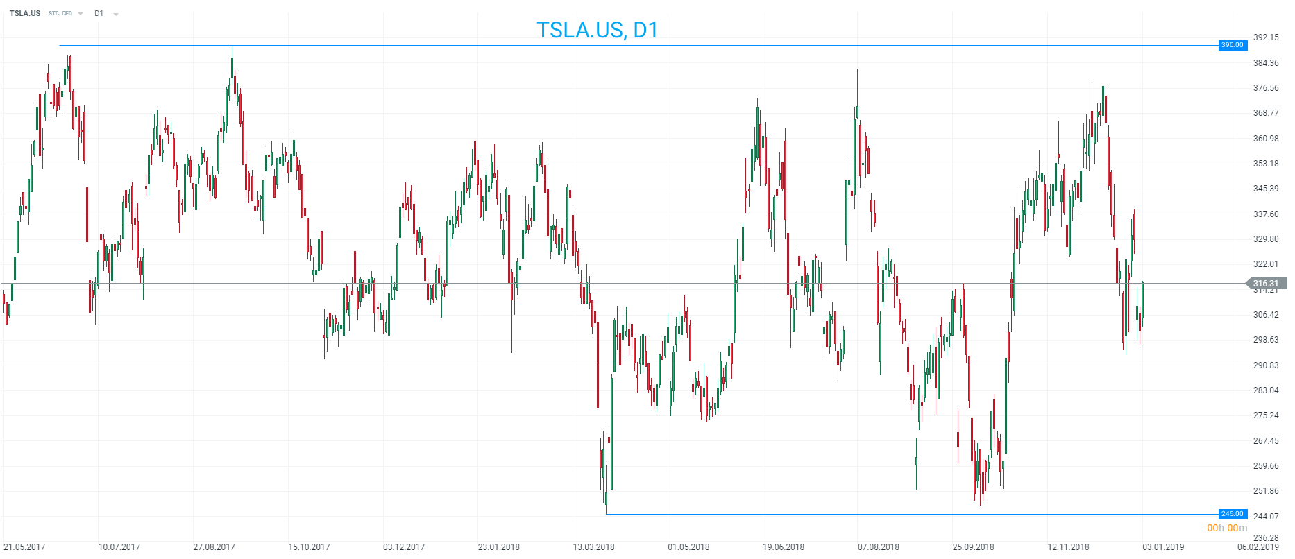 Tesla a înregistrat performanțe remarcabile în timpul corecției de pe piața de capital din ultimele luni. Acțiunea a încheiat sesiunea de vineri la jumătatea intervalului 245 - 390, marcând o creștere de 5%. Sursa: xStation5