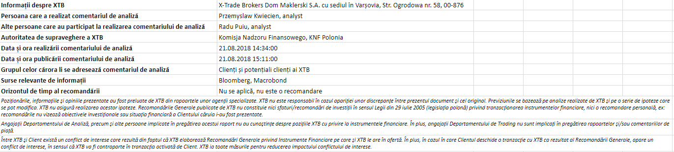 "Acest material este o comunicare de marketing în sensul articolului 24 alineatul (3) din Directiva 2014/65 / UE a Parlamentului European și a Consiliului din 15 mai 2014 privind piețele de instrumente financiare, și de modificare a Directivei 2002/92 / CE și a Directivei 2011 / 61 / UE (MiFID II). Comunicarea de marketing nu este o recomandare de investiții sau o recomandare de informații sau o recomandare care sugerează o strategie de investiții în sensul Regulamentului (UE) nr. 596/2014 al Parlamentului European și al Consiliului din 16 aprilie 2014 privind abuzul de piață ( reglementarea abuzului de piață) și de abrogare a Directivei 2003/6 / CE a Parlamentului European și a Consiliului și a Directivelor Comisiei 2003/124 / CE, 2003/125 / CE și 2004/72 / CE și a Regulamentului delegat (UE) 2016/958 al Comisiei din 9 596/2014 al Parlamentului European și al Consiliului în ceea ce privește standardele tehnice de reglementare pentru aranjamentele tehnice pentru prezentarea obiectivă a recomandărilor de investiții sau a altor informații care sugerează strategii de investiții și pentru dezvăluirea de interese particulare sau indicații de conflicte de interese sau orice alte sfaturi, inclusiv în domeniul consultanței în materie de investiții, în sensul Legii privind tranzacționarea cu instrumente financiare din 29 iulie 2005 (de ex. Journal of Laws 2019, articolul 875, astfel cum a fost modificat). Comunicarea de marketing este pregătită cu cea mai mare diligență, obiectivitate, prezintă faptele cunoscute autorului la data pregătirii și este lipsită de orice elemente de evaluare. Comunicarea de marketing este pregătită fără a lua în considerare nevoile clientului, situația sa financiară individuală și nu prezintă nicio strategie de investiții în niciun fel. Comunicarea de marketing nu constituie o ofertă de vânzare, oferire, abonament, invitație la cumpărare, reclamă sau promovare a oricărui instrument financiar. XTB SA nu este responsabilă pentru acțiunile sau omisiunile niciunui client, în special pentru achiziționarea sau cedarea instrumente, întreprinse pe baza informațiilor conținute în această comunicare de marketing. XTB SA nu va accepta răspunderea pentru nicio pierdere sau daună, inclusiv, fără limitare, orice pierdere care poate apărea direct sau indirect, efectuată pe baza informațiilor conținute în această comunicare de marketing. În cazul în care comunicarea de marketing conține informații despre orice rezultat cu privire la instrumentele financiare indicate în acestea, acestea nu constituie nicio garanție sau prognoză cu privire la rezultatele viitoare. Performanțele anterioare nu indică neapărat rezultatele viitoare și orice persoană care acționează pe baza acestor informații o face pe propriul risc. Acest material nu este emis pentru a influenta deciziile de tranzacționare ale niciunei persoane. Informațiile cuprinse în cadrul acestui material nu sunt prezentate pentru a fi aplicate, copiate sau testate în cadrul tranzacțiilor dumneavoastră. Informațiile cuprinse în cadrul acestui material sunt emise în baza experienței proprii a emitentului și nu reprezintă o recomandare individuală, nu vizează atingerea anumitor obiective, randamente financiare și nu se adresează nevoilor niciunei persoane anume care ar primi-o. Premisele acestui material nu au în vedere situația și persoana dumneavoastră deci nu recomandăm utilizarea acestor informații sub orice formă. Utilizarea informațiilor cuprinse în cadrul acestui material în orice modalitate se face pe propria dumneavoastră răspundere. Acest material este emis de către un analist pentru care își asumă răspunderea XTB SA, persoană juridică autorizată de KNF – Autoritatea de Supraveghere Financiara din Polonia."
