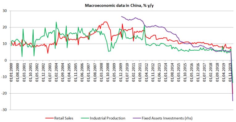 În timp ce amploarea daunelor economice din Europa și SUA rămâne nesigură, ne putem uita la China drept exemplu. Am raportat înainte ca activitatea s-a contractat în mai multe sectoare cu peste 80% YoY în timpul ”blocajului economiei”. Raportul lunar de astăzi arată că producția industrială a scăzut cu 13,5%, iar vânzările de retail cu 20% YoY. Cu toate acestea, datele sunt pentru ianuarie și februarie. Acest lucru înseamnă că producția a scăzut cel mai probabil cu peste 30% și vânzările cu aproape de 50% doar în luna februarie. Este primul scenariu de acest tip din istorie. O veste bună este că economia Chinei se întoarce cu adevărat la locul de muncă - traficul a crescut foarte mult în ultima săptămână și acest lucru pare a fi în concordanță cu scăderea rapidă a numărului de noi cazuri. Vestea proastă este că cererea de produse din China va avea de suferit, iar o economie slabă a Chinei nu va ajuta situația din alte regiuni.