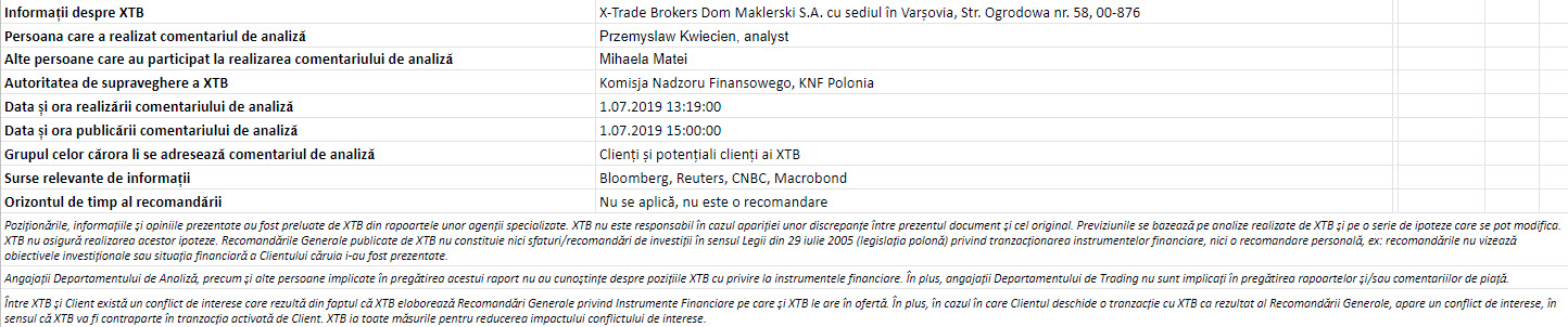 "Acest material este o comunicare de marketing în sensul articolului 24 alineatul (3) din Directiva 2014/65 / UE a Parlamentului European și a Consiliului din 15 mai 2014 privind piețele de instrumente financiare, și de modificare a Directivei 2002/92 / CE și a Directivei 2011 / 61 / UE (MiFID II). Comunicarea de marketing nu este o recomandare de investiții sau o recomandare de informații sau o recomandare care sugerează o strategie de investiții în sensul Regulamentului (UE) nr. 596/2014 al Parlamentului European și al Consiliului din 16 aprilie 2014 privind abuzul de piață ( reglementarea abuzului de piață) și de abrogare a Directivei 2003/6 / CE a Parlamentului European și a Consiliului și a Directivelor Comisiei 2003/124 / CE, 2003/125 / CE și 2004/72 / CE și a Regulamentului delegat (UE) 2016/958 al Comisiei din 9 596/2014 al Parlamentului European și al Consiliului în ceea ce privește standardele tehnice de reglementare pentru aranjamentele tehnice pentru prezentarea obiectivă a recomandărilor de investiții sau a altor informații care sugerează strategii de investiții și pentru dezvăluirea de interese particulare sau indicații de conflicte de interese sau orice alte sfaturi, inclusiv în domeniul consultanței în materie de investiții, în sensul Legii privind tranzacționarea cu instrumente financiare din 29 iulie 2005 (de ex. Journal of Laws 2019, articolul 875, astfel cum a fost modificat). Comunicarea de marketing este pregătită cu cea mai mare diligență, obiectivitate, prezintă faptele cunoscute autorului la data pregătirii și este lipsită de orice elemente de evaluare. Comunicarea de marketing este pregătită fără a lua în considerare nevoile clientului, situația sa financiară individuală și nu prezintă nicio strategie de investiții în niciun fel. Comunicarea de marketing nu constituie o ofertă de vânzare, oferire, abonament, invitație la cumpărare, reclamă sau promovare a oricărui instrument financiar. XTB SA nu este responsabilă pentru acțiunile sau omisiunile niciunui client, în special pentru achiziționarea sau cedarea instrumente, întreprinse pe baza informațiilor conținute în această comunicare de marketing. XTB SA nu va accepta răspunderea pentru nicio pierdere sau daună, inclusiv, fără limitare, orice pierdere care poate apărea direct sau indirect, efectuată pe baza informațiilor conținute în această comunicare de marketing. În cazul în care comunicarea de marketing conține informații despre orice rezultat cu privire la instrumentele financiare indicate în acestea, acestea nu constituie nicio garanție sau prognoză cu privire la rezultatele viitoare. Performanțele anterioare nu indică neapărat rezultatele viitoare și orice persoană care acționează pe baza acestor informații o face pe propriul risc. Acest material nu este emis pentru a influenta deciziile de tranzacționare ale niciunei persoane. Informațiile cuprinse în cadrul acestui material nu sunt prezentate pentru a fi aplicate, copiate sau testate în cadrul tranzacțiilor dumneavoastră. Informațiile cuprinse în cadrul acestui material sunt emise în baza experienței proprii a emitentului și nu reprezintă o recomandare individuală, nu vizează atingerea anumitor obiective, randamente financiare și nu se adresează nevoilor niciunei persoane anume care ar primi-o. Premisele acestui material nu au în vedere situația și persoana dumneavoastră deci nu recomandăm utilizarea acestor informații sub orice formă. Utilizarea informațiilor cuprinse în cadrul acestui material în orice modalitate se face pe propria dumneavoastră răspundere. Acest material este emis de către un analist pentru care își asumă răspunderea XTB SA, persoană juridică autorizată de KNF – Autoritatea de Supraveghere Financiara din Polonia."