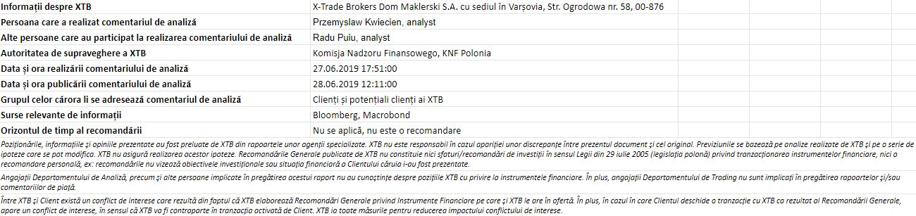 "Acest material este o comunicare de marketing în sensul articolului 24 alineatul (3) din Directiva 2014/65 / UE a Parlamentului European și a Consiliului din 15 mai 2014 privind piețele de instrumente financiare, și de modificare a Directivei 2002/92 / CE și a Directivei 2011 / 61 / UE (MiFID II). Comunicarea de marketing nu este o recomandare de investiții sau o recomandare de informații sau o recomandare care sugerează o strategie de investiții în sensul Regulamentului (UE) nr. 596/2014 al Parlamentului European și al Consiliului din 16 aprilie 2014 privind abuzul de piață ( reglementarea abuzului de piață) și de abrogare a Directivei 2003/6 / CE a Parlamentului European și a Consiliului și a Directivelor Comisiei 2003/124 / CE, 2003/125 / CE și 2004/72 / CE și a Regulamentului delegat (UE) 2016/958 al Comisiei din 9 596/2014 al Parlamentului European și al Consiliului în ceea ce privește standardele tehnice de reglementare pentru aranjamentele tehnice pentru prezentarea obiectivă a recomandărilor de investiții sau a altor informații care sugerează strategii de investiții și pentru dezvăluirea de interese particulare sau indicații de conflicte de interese sau orice alte sfaturi, inclusiv în domeniul consultanței în materie de investiții, în sensul Legii privind tranzacționarea cu instrumente financiare din 29 iulie 2005 (de ex. Journal of Laws 2019, articolul 875, astfel cum a fost modificat). Comunicarea de marketing este pregătită cu cea mai mare diligență, obiectivitate, prezintă faptele cunoscute autorului la data pregătirii și este lipsită de orice elemente de evaluare. Comunicarea de marketing este pregătită fără a lua în considerare nevoile clientului, situația sa financiară individuală și nu prezintă nicio strategie de investiții în niciun fel. Comunicarea de marketing nu constituie o ofertă de vânzare, oferire, abonament, invitație la cumpărare, reclamă sau promovare a oricărui instrument financiar. XTB SA nu este responsabilă pentru acțiunile sau omisiunile niciunui client, în special pentru achiziționarea sau cedarea instrumente, întreprinse pe baza informațiilor conținute în această comunicare de marketing. XTB SA nu va accepta răspunderea pentru nicio pierdere sau daună, inclusiv, fără limitare, orice pierdere care poate apărea direct sau indirect, efectuată pe baza informațiilor conținute în această comunicare de marketing. În cazul în care comunicarea de marketing conține informații despre orice rezultat cu privire la instrumentele financiare indicate în acestea, acestea nu constituie nicio garanție sau prognoză cu privire la rezultatele viitoare. Performanțele anterioare nu indică neapărat rezultatele viitoare și orice persoană care acționează pe baza acestor informații o face pe propriul risc. Acest material nu este emis pentru a influenta deciziile de tranzacționare ale niciunei persoane. Informațiile cuprinse în cadrul acestui material nu sunt prezentate pentru a fi aplicate, copiate sau testate în cadrul tranzacțiilor dumneavoastră. Informațiile cuprinse în cadrul acestui material sunt emise în baza experienței proprii a emitentului și nu reprezintă o recomandare individuală, nu vizează atingerea anumitor obiective, randamente financiare și nu se adresează nevoilor niciunei persoane anume care ar primi-o. Premisele acestui material nu au în vedere situația și persoana dumneavoastră deci nu recomandăm utilizarea acestor informații sub orice formă. Utilizarea informațiilor cuprinse în cadrul acestui material în orice modalitate se face pe propria dumneavoastră răspundere. Acest material este emis de către un analist pentru care își asumă răspunderea XTB SA, persoană juridică autorizată de KNF – Autoritatea de Supraveghere Financiara din Polonia."
