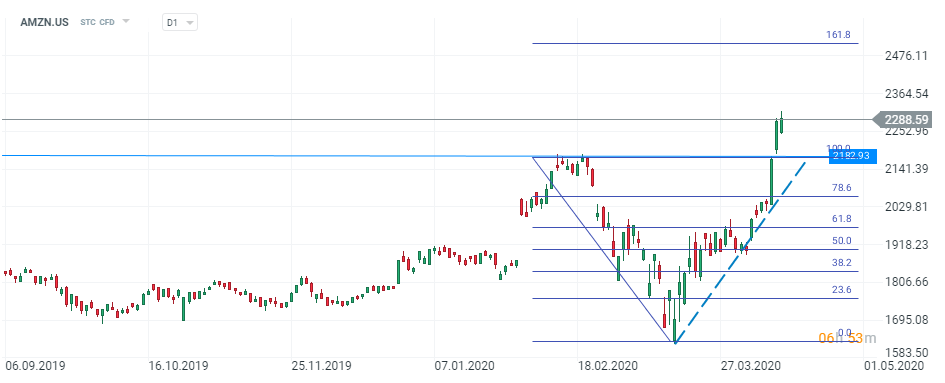 În acest context, acțiunile companiei au reușit să recupereze în totalitate corecția suferită începând din a doua jumătatea a lunii februarie. Mai mult, cotația a reușit să depășească un nivel cheie de rezistență sub forma maximelor istorice de la 2183 USD. Având în vedere că ne aflăm la niveluri care nu au mai fost vizitate, următorul obiectiv pentru cumpărători pare a fi în zona 2514, care este susținută de o retragere exterioară Fibonacci de 161,8% din corecția descendentă din perioada februarie - martie. Fosta zonă a maximelor istorice (2183 USD) oferă susținere în acest moment.