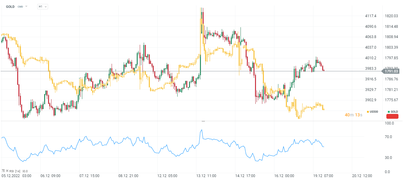 Vineri, am observat o slăbiciune a indicilor americani, parțial din cauza expirării opțiunilor în cea de-a 16-a zi a celor „trei vrăjitoare”, ultima lună a anului. Aurul a ignorat scăderile de vineri pe Wall Street și a arătat o divergență optimistă cu contractele S&P 500. Astăzi reia corelația cu indicii și se află încă sub limita psihologică de 1.800 USD de unde poate fi declanșat un impuls descendent.
