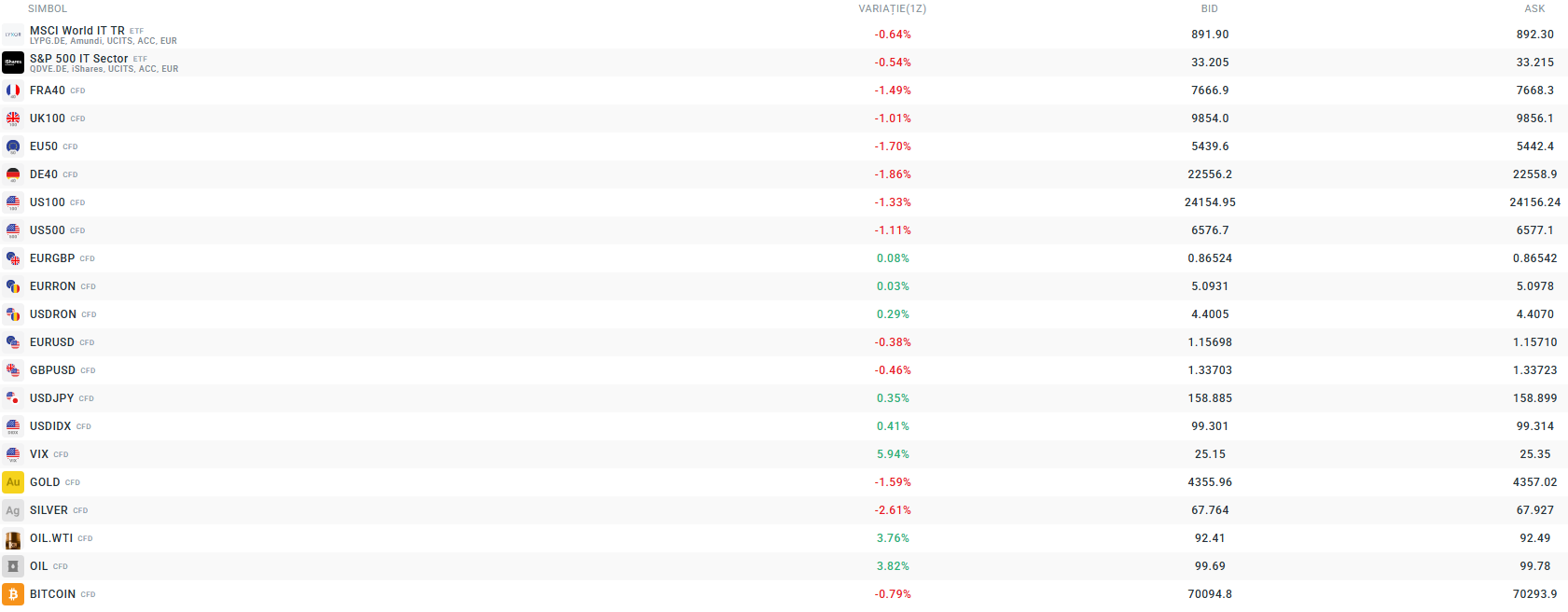 - OIL și OIL.WTI înregistrează o creștere de peste 1%, deși prețurile se mențin sub 98 USD pe baril.