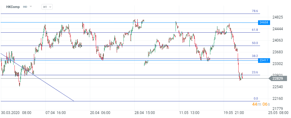 Din punct de vedere tehnic, situația nu este prea optimistă pentru cumpărători. În ciuda faptului că în ultimele ore a avut loc o încercare de redresare, nivelul de rezistență de la 22950 de puncte s-a dovedit prea puternic pentru moment. Acesta este susținut de mai multe reacții anterioare de preț, dar și de o retragere Fibonacci de 23,6% din secvența descendentă din perioada 10 - 13 martie. Scenariul de bază pare mai degrabă unul negativ, primul nivel de suport fiind sub forma minimelor locale de la 22560 puncte. Totuși, acesta ar putea fi doar un prag intermediar, obiectivul principal pentru vânzători fiind punctul de sfârșit al impulsului corectiv din zona 22080. Intrarea în vigoare a proiectului de lege ar putea marca sfârșitul perioadei ”o țară, două sisteme”.