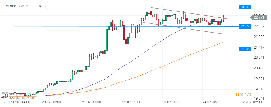 Din punct de vedere tehnic, argintul se află într-o situație interesantă. Analizând graficul de o oră se poate observa trasarea unei formațiuni de Steag bullish, care, în mod normal, reprezintă un model de continuare a trendului existent, care este ascendent. Astfel, o spargere a limitei superioare a canalului ce trasează steagul din zona 22,744 ar oferi un argument pozitiv pentru cumpărători. O astfel de evoluție este de înțeles având în vedere creșterea rapidă a metalului prețios. O perioadă de pauză și de reașezare reprezintă un argument pro pentru un trend ”sănătos”, mai ales că prețul argintului este aproape exclusiv condus de către o cerere puternică de investiții. În cazul unei spargeri ascendente, nivelul de la 23,240 de dolari reprezintă următorul nivel țintă pentru cumpărători.