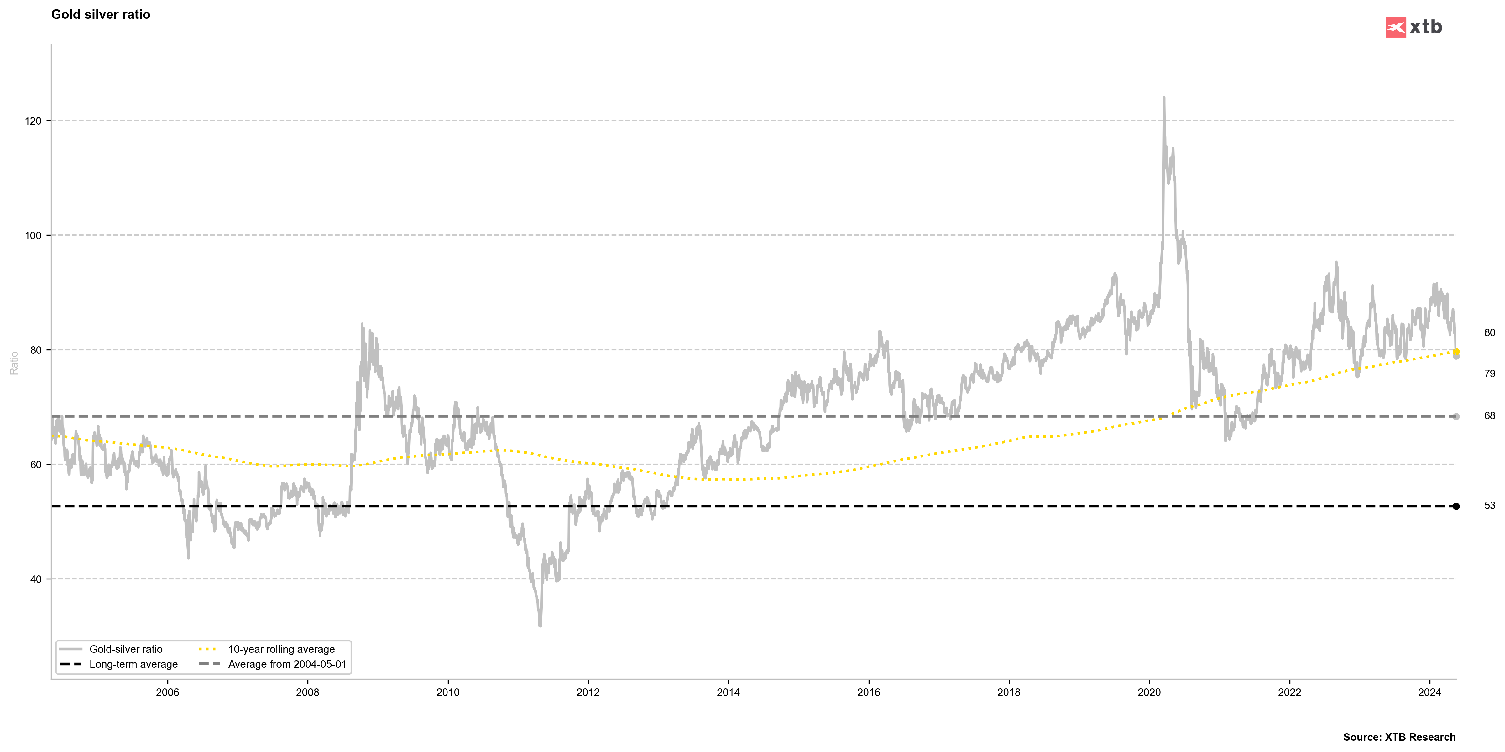 Raportul dintre prețul aurului și cel al argintului a coborât deja până la media mobilă pe 10 ani, ceea ce poate fi considerat primul reper important. Următoarea ar putea fi media statică pe 20 de ani, care este aproape de minimele din 2017 și 2021. Această medie se află la nivelul 68. Presupunând un preț al aurului de 2.400 de dolari, acest lucru ar da o evaluare pentru argint de 35,3 dolari pe uncie, sau mai mult de 12% din mișcarea implicită de la nivelurile actuale. Acest lucru ar însemna, de asemenea, o testare a vârfurilor locale din septembrie 2012. În plus, media pe termen lung se situează la 53 pentru raportul de preț, ceea ce, în condițiile în care aurul se află la 2.400 de dolari pe uncie, ar da o evaluare a argintului în jurul nivelului de 45 de dolari pe uncie. Cu toate acestea, merită să ne amintim că creșterile la argint necesită cel puțin menținerea unor niveluri ridicate la aur, chiar dacă cererea de argint este determinată în proporție de peste 50% de industrie. Creșterile la argint pot fi legate și de dorința BHP de a achiziționa Anglo American. Compania australiană este interesată în principal de activele legate de cupru, iar mineritul cuprului este adesea asociat și cu mineritul argintului.