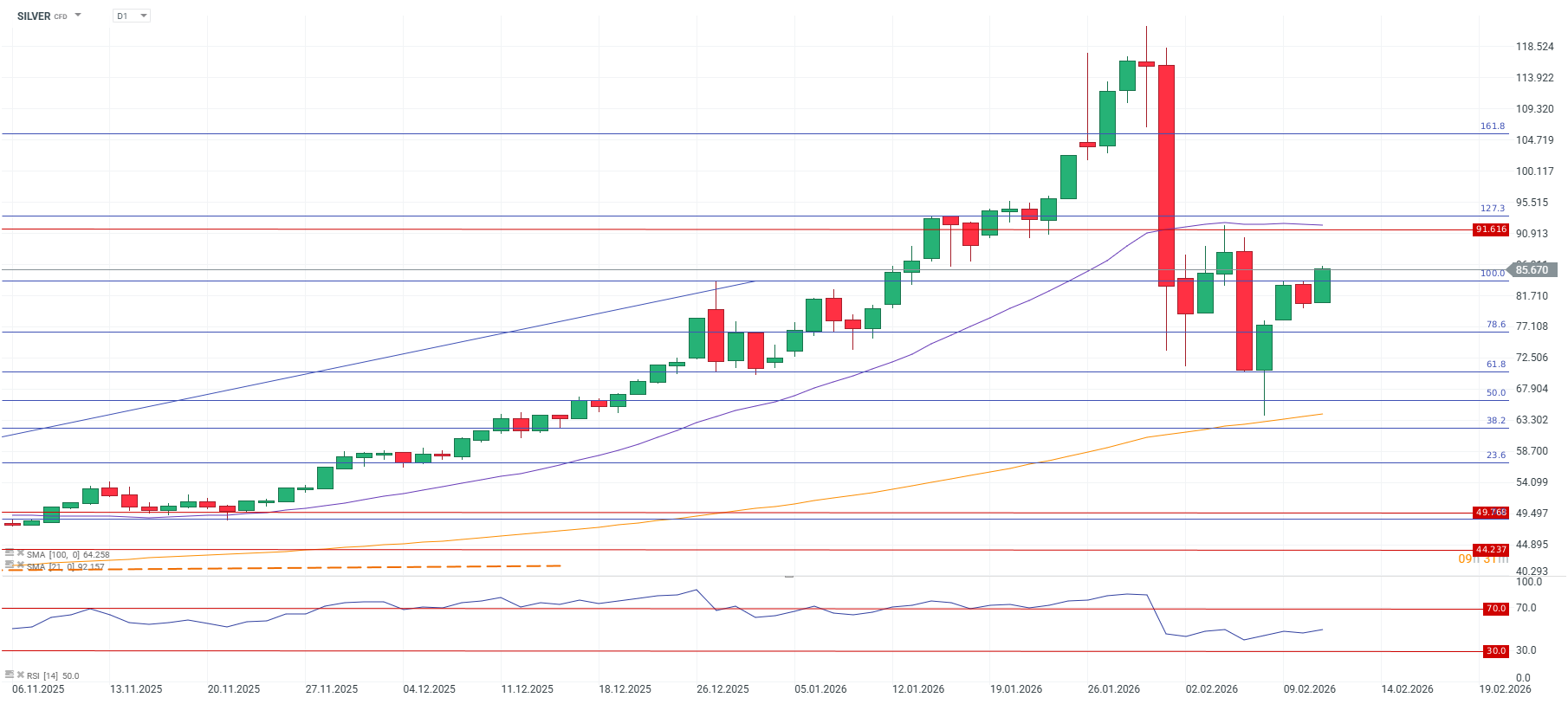 În ciuda faptului că se află cu aproximativ 30% sub maximul istoric atins în ianuarie la peste 121 USD, imaginea tehnică a argintului devine optimistă. Nivelul de rezistență de la 64 USD, în zona căruia se află și media mobilă de 100 de zile (dreapta albastră), a rezistat în fața presiunii de vânzare.