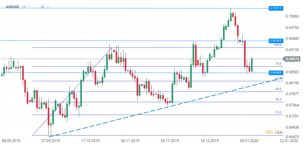 Analizând graficul daily, observăm că moneda de la Antipozi a încheiat anul într-o manieră pozitivă profitând de apetitul pentru risc al investitorilor de la sfârșit de an dar și de perioada slabă traversată de dolarul american. Totuși, nivelul de rezistență de la 0,70313 s-a dovedit a fi un obstacol prea puternic pentru cumpărători la acel moment iar prețul a ricoșat în sens descendent, corecție ce s-a accentuat odată cu escaladarea tensiunilor din Orientul Mijlociu. Impulsul de scădere a fost oprit de nivelul 0,68488. Sesiunea de astăzi aduce o încercare de revenire a AUD care este susținută de argumente fundamentale pe plan local și este favorizată de retragerea dolarului american ca urmare a datelor macroeconomice slabe. Prima provocare pentru cumpărători ar putea fi în zona 0,69200 care este susținută de o retragere Fibonacci de 100% din impulsul ascendent început în prima zi a lunii octombrie. În cazul în care acest prag va fi depășit, drumul pare a fi liber până la 0,70313, unde se află maximul local înregistrat la sfârșitul anului. Cel mai apropiat nivel de suport se găsește la 0,68488, dar cel mai puternic ”aliat” al cumpărătorilor s-ar putea afla la 0,68250 unde se intersectează o retragere Fibonacci de 61,8% din mișcarea menționată anterior cu linia ascendentă de trend a aceluiași impuls.