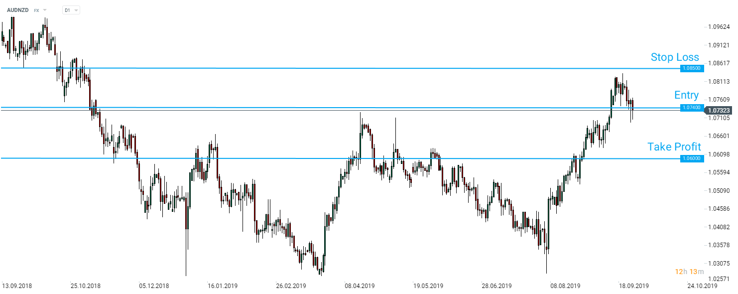 Banca sugerează plasarea unei poziții short pe AUDNZD cu următorii parametrii: