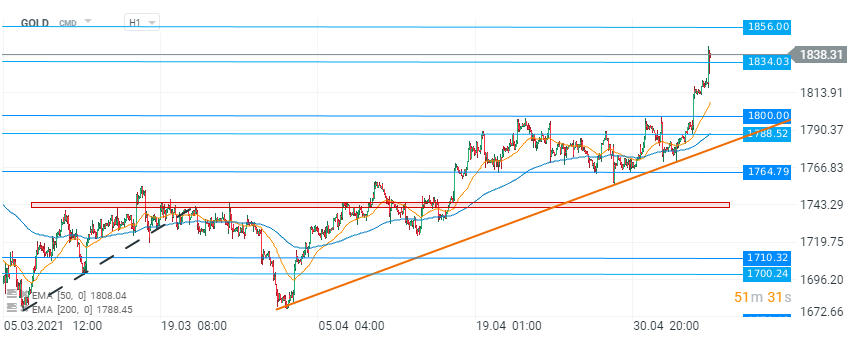 Aurul a atins un maxim intraday la 1.843 USD per uncie, cel mai ridicat nivel de pe 11 februarie, după ce Departamentul Muncii din SUA a raportat că economia a creat 266.000 de noi locuri de muncă în aprilie, cu mult mai puțin chiar și decât cea mai pesimistă prognoză, fapt ce a tras o serie de semnale de alarmă cu privire la forța și ritmul redresării după pandemie.