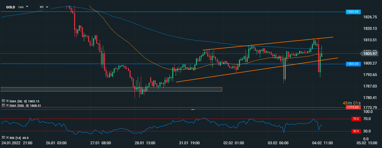 Din punct de vedere tehnic, metalul prețios evoluează în interiorul unui canal ascendent, care, deși a fost spart în timpul publicării datelor NFP, cotația a reușit să se reîntoarcă în interiorul acestuia. În plus, cumpărătorii au reușit să apere suportul tehnologic de la 1.800 USD, ceea ce îi pune într-o poziție destul de solidă. Atâta timp cât limita inferioară a formațiunii nu va fi spartă într-o manieră sustenabilă, metalul prețios și-ar putea continua avansul, dar într-un ritm destul de lent.