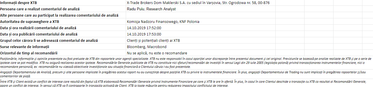 "Acest material este o comunicare de marketing în sensul articolului 24 alineatul (3) din Directiva 2014/65 / UE a Parlamentului European și a Consiliului din 15 mai 2014 privind piețele de instrumente financiare, și de modificare a Directivei 2002/92 / CE și a Directivei 2011 / 61 / UE (MiFID II). Comunicarea de marketing nu este o recomandare de investiții sau o recomandare de informații sau o recomandare care sugerează o strategie de investiții în sensul Regulamentului (UE) nr. 596/2014 al Parlamentului European și al Consiliului din 16 aprilie 2014 privind abuzul de piață ( reglementarea abuzului de piață) și de abrogare a Directivei 2003/6 / CE a Parlamentului European și a Consiliului și a Directivelor Comisiei 2003/124 / CE, 2003/125 / CE și 2004/72 / CE și a Regulamentului delegat (UE) 2016/958 al Comisiei din 9 596/2014 al Parlamentului European și al Consiliului în ceea ce privește standardele tehnice de reglementare pentru aranjamentele tehnice pentru prezentarea obiectivă a recomandărilor de investiții sau a altor informații care sugerează strategii de investiții și pentru dezvăluirea de interese particulare sau indicații de conflicte de interese sau orice alte sfaturi, inclusiv în domeniul consultanței în materie de investiții, în sensul Legii privind tranzacționarea cu instrumente financiare din 29 iulie 2005 (de ex. Journal of Laws 2019, articolul 875, astfel cum a fost modificat). Comunicarea de marketing este pregătită cu cea mai mare diligență, obiectivitate, prezintă faptele cunoscute autorului la data pregătirii și este lipsită de orice elemente de evaluare. Comunicarea de marketing este pregătită fără a lua în considerare nevoile clientului, situația sa financiară individuală și nu prezintă nicio strategie de investiții în niciun fel. Comunicarea de marketing nu constituie o ofertă de vânzare, oferire, abonament, invitație la cumpărare, reclamă sau promovare a oricărui instrument financiar. XTB SA nu este responsabilă pentru acțiunile sau omisiunile niciunui client, în special pentru achiziționarea sau cedarea instrumente, întreprinse pe baza informațiilor conținute în această comunicare de marketing. XTB SA nu va accepta răspunderea pentru nicio pierdere sau daună, inclusiv, fără limitare, orice pierdere care poate apărea direct sau indirect, efectuată pe baza informațiilor conținute în această comunicare de marketing. În cazul în care comunicarea de marketing conține informații despre orice rezultat cu privire la instrumentele financiare indicate în acestea, acestea nu constituie nicio garanție sau prognoză cu privire la rezultatele viitoare. Performanțele anterioare nu indică neapărat rezultatele viitoare și orice persoană care acționează pe baza acestor informații o face pe propriul risc. Acest material nu este emis pentru a influenta deciziile de tranzacționare ale niciunei persoane. Informațiile cuprinse în cadrul acestui material nu sunt prezentate pentru a fi aplicate, copiate sau testate în cadrul tranzacțiilor dumneavoastră. Informațiile cuprinse în cadrul acestui material sunt emise în baza experienței proprii a emitentului și nu reprezintă o recomandare individuală, nu vizează atingerea anumitor obiective, randamente financiare și nu se adresează nevoilor niciunei persoane anume care ar primi-o. Premisele acestui material nu au în vedere situația și persoana dumneavoastră deci nu recomandăm utilizarea acestor informații sub orice formă. Utilizarea informațiilor cuprinse în cadrul acestui material în orice modalitate se face pe propria dumneavoastră răspundere. Acest material este emis de către un analist pentru care își asumă răspunderea XTB SA, persoană juridică autorizată de KNF – Autoritatea de Supraveghere Financiara din Polonia."