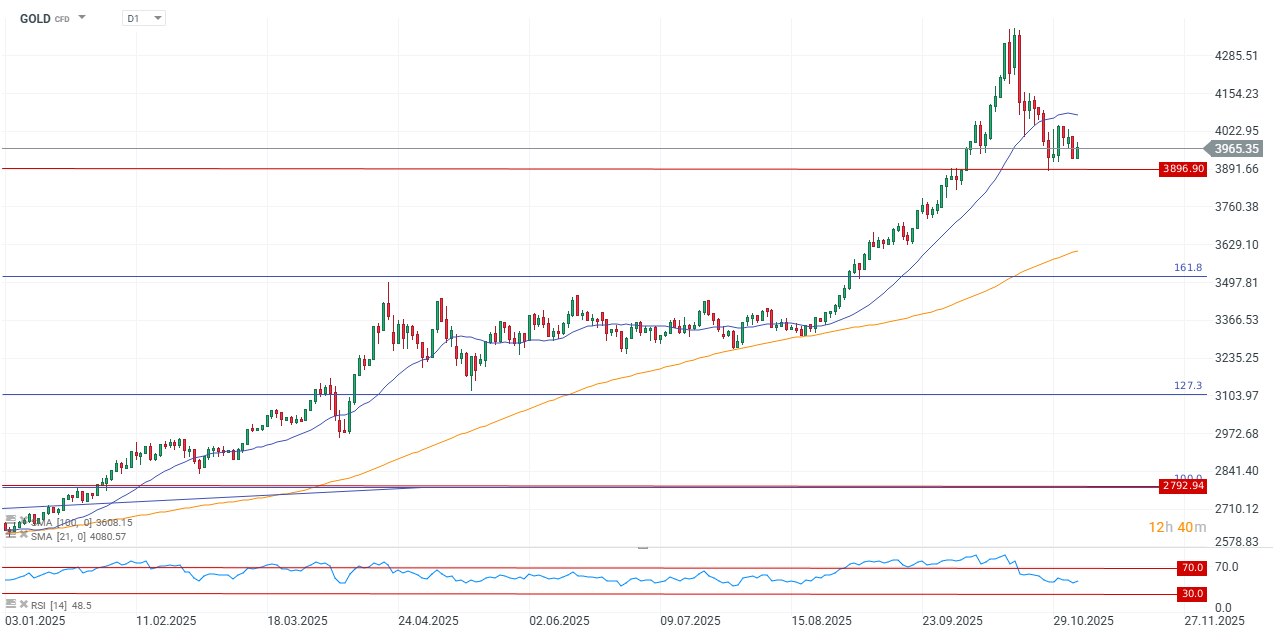 Corecția recentă pare că și-a pierdut din intensitate pe măsură ce prețul s-a apropiat de zona de suport de la 3.900 USD. În prezent, o închidere deasupra pragului de 4.000 USD, cu un volum mare, ar semnala o tendință de apreciere. O spargere clară sub 3.900 USD ar putea atrage mai mulți vânzători, mai ales dacă ținem cont că următoarea zona de suport este media mobilă de 100 de perioade (dreapta galbenă), care în prezent este 3.608 USD. Traderii pe termen scurt ar trebui să urmărească nivelurile zilnice de închidere și volumul. Indicatorii de momentum sugerează un sentiment mixt.