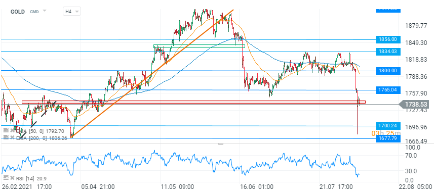 Din punct de vedere tehnic, graficul H4 al aurului ne sugerează o potențială oportunitate de redresare. Un prim semnal optimist pentru preț a fost faptul că zona de suport 1.741 - 1.746 USD a rezistat, oferind încredere cumpărătorilor. Corecția de la începutul sesiunii a trimis indicatorul de sentiment RSI în teritoriul de supravânzare, fapt care ar putea să îi pună pe gânduri pe tauri. Scenariile similare recente nu au dus la perioade lungi în care etalonul să evolueze sub zona de 30 de puncte, motiv pentru care trecutul pare să fie favorabil pentru o potențială revenire. În cazul în care se va observa o spargere a nivelului menționat anterior, cotația ar putea să încerce o testare a zonei 1.765 USD, care este marcată de mai multe reacții de preț din trecut. În caz contrar, am putea discuta despre o posibilă încercare de împingere a prețului către pragul psihologic de 1.700 USD.
