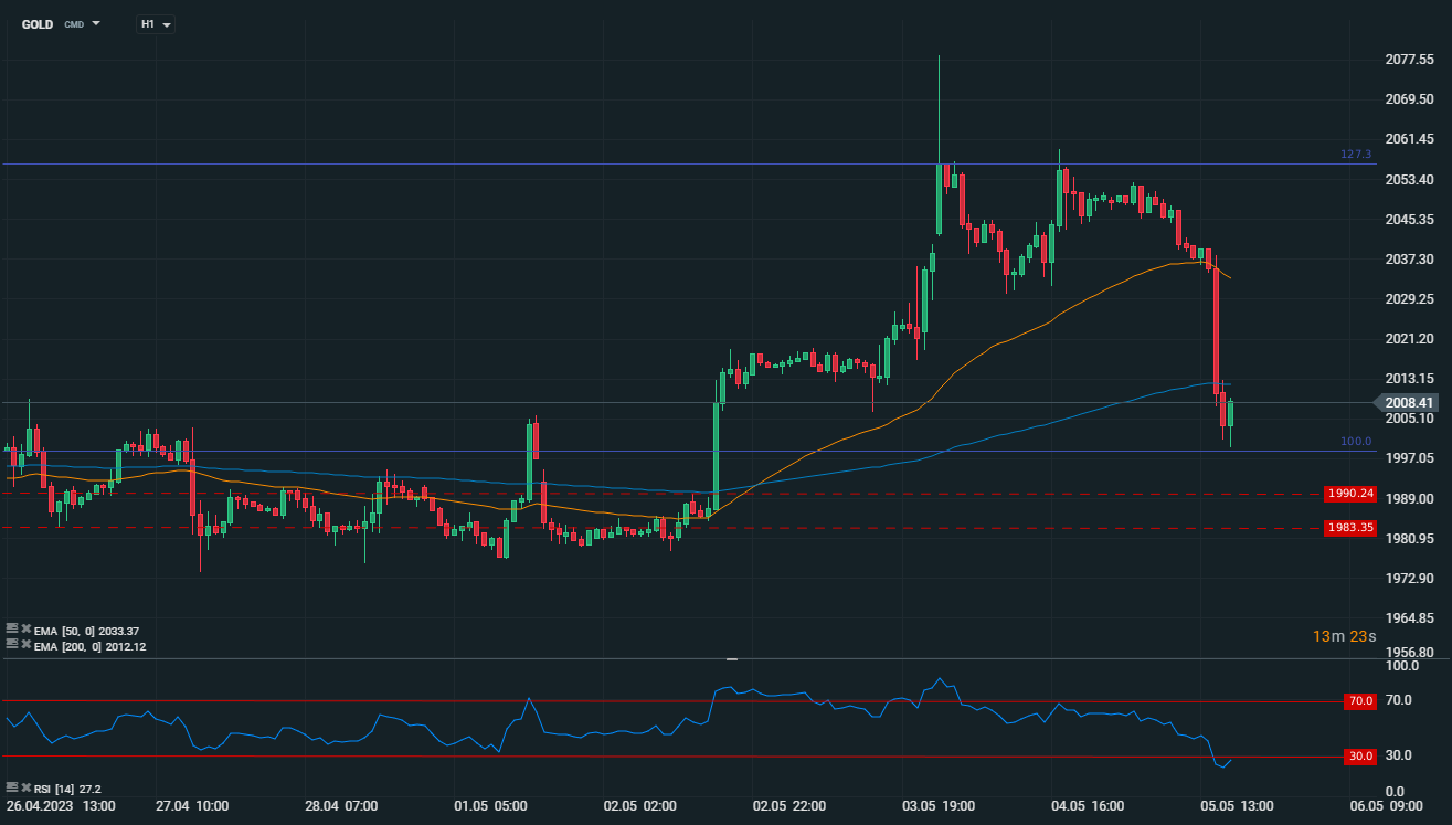 Din punct de vedere tehnic, aurul a scăzut cu aproape 4% de la începutul sesiunii de joi pe fondul schimbării narațiunii din rândul investitorilor. Corecția, deși justificată din punct de vedere fundamental, a fost prea intensă iar cumpărătorii au reacționat în vecinătatea pragului de 2.000 USD. Având în vedere importanța acestui nivel psihologic putem presupune că aici erau plasat un volum considerabil de ordine de cumpărare. Indicatorul RSI a indicat scăderea sub limita inferioară de 30 de puncte, ceea ce a reprezentat un alt motiv de redresare. În prezent, principala zona de suport este la 2.000 USD și rezistențele se află la 2.012 și 2.033 USD, unde se află mediile mobile de 200 și 50 de perioade (liniile albastre și portocalii).
