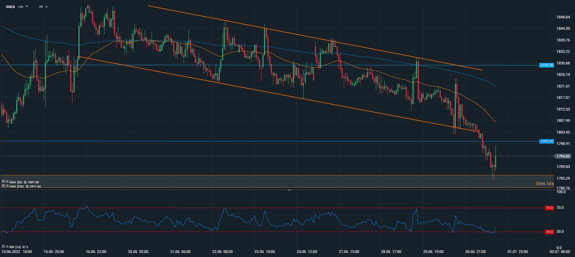 Din punct de vedere tehnic, prețul a părăsit într-o manieră agresivă canalul descendent de trend și a spart zona psihologică de suport de la 1.800 USD. Această mișcare extrem de dinamică de astăzi a alimentat corecția, iar aurul a atins un minim intraday la 1.784 USD, care reprezintă valoarea mediană a intervalului de suport pe termen lung 1.782 - 1.786 USD. Această zonă marchează minimele din acest an motiv pentru care are o relevanță mare pentru investitori. Ricoșeul de acolo arată că taurii nu sunt dispuși, cel puțin pentru moment, să renunțe la ”bătălie”, motiv pentru care pragul 1.800 USD este principalul obiectiv al acestora.