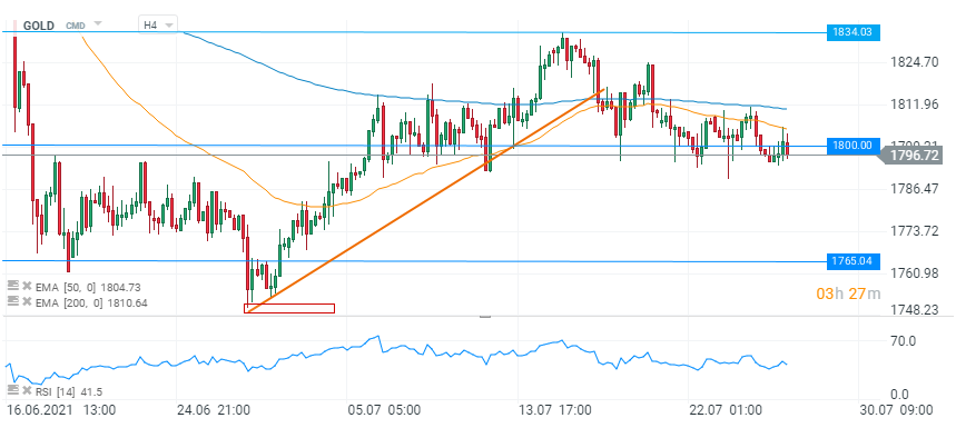 Din punct de vedere tehnic, situația aurului pare la fel de indecisă. Pe graficul H4, cotația este blocată între pragul psihologic de 1.800 USD și cele două medii mobile, care au limitat avansul cumpărătorilor. Acest interval s-ar putea menține până în momentul deciziei FOMC de mâine seară, care ne-ar putea aduce o spargere. În cazul unui avans, drumul ar putea fi deschis către pragul 1.834 USD, în caz contrar, zona 1.765 USD pare a fi obiectivul vânzătorilor.