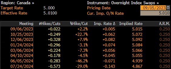 - Piețele setează la aproape 100% probabilitatea ca BoC să mențină ratele neschimbate la ședința de mâine, după ce a majorat ratele cu 25 pb în iunie și iulie