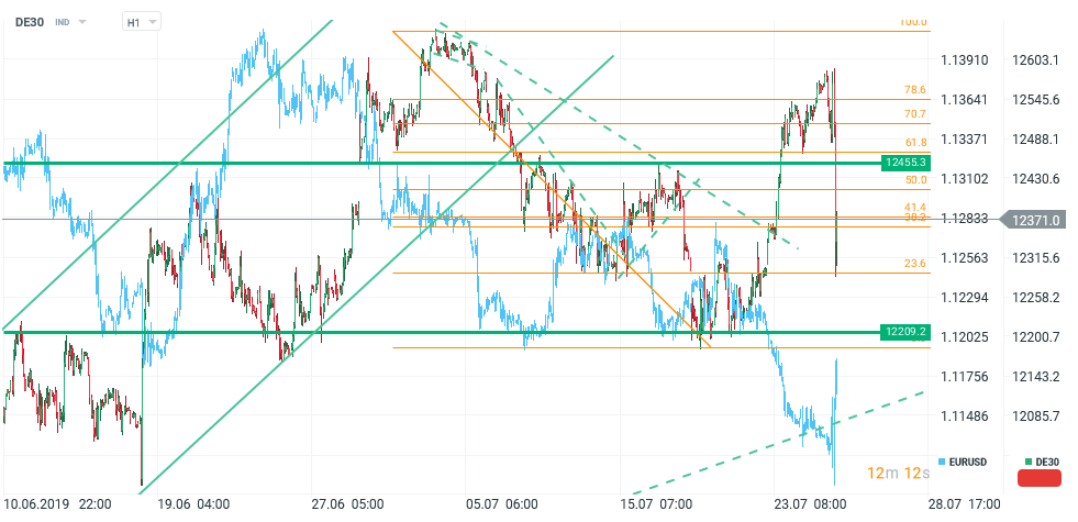 Grafic DE30, EURUSD (albastru) - H1. Sursa: xStation5