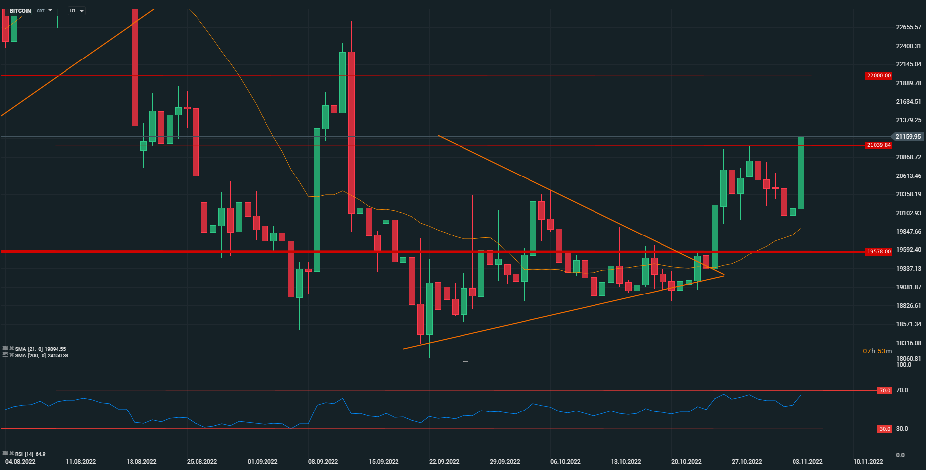 Astfel, Bitcoin avansează cu 5% la momentul scrierii, depășind nivelul de rezistență locală din vecinătatea pragului de 21.000 USD, atingând astfel cel mai ridicat nivel din 13 septembrie. Extinderea sentimentului pozitiv pe piețele de capital poate ajuta activele digitale să își continue mișcarea de creștere. Totuși, în cazul schimbării atitudinii cea mai mare monedă digitală ar putea fi afectată de o secvență de marcare a profitului. În acest sens, nivelul de 21.000 USD este suportul cheie de urmărit.