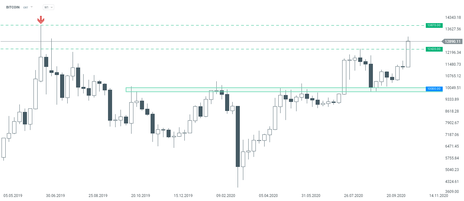 Privind din punct de vedere tehnic, prețul Bitcoin s-a aflat pe o tendință ascendentă începând din a doua jumătate a lunii martie. Depășirea maximelor locale de la 12.420 de dolari a deschis calea către maximele de anul trecut, la 13.870 dolari.