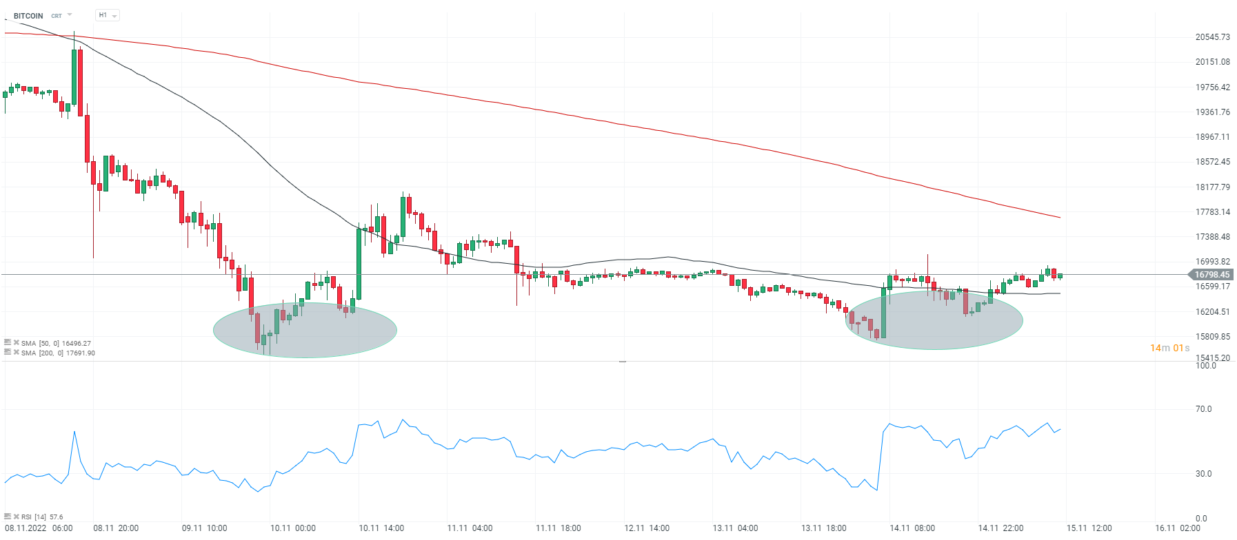 Bitcoin, interval H1. Privind graficul criptomonedei majore, putem observa o formațiune Double Bottom, aproape de 15.600 USD, care a scos deja de două ori Bitcoin din probleme, ducând la o revenire. Scăderea recentă sub 16.000 USD a fost oprită de o lumânare de cumpărare foarte amplă, construită pe volum mare. Criptomoneda se tranzacționează din nou peste media SMA50 și are șansa de a testa rezistența majoră sub forma mediei mobile de 200 de sesiuni, care se ridică la 17.600 USD. Sursa: xStation5