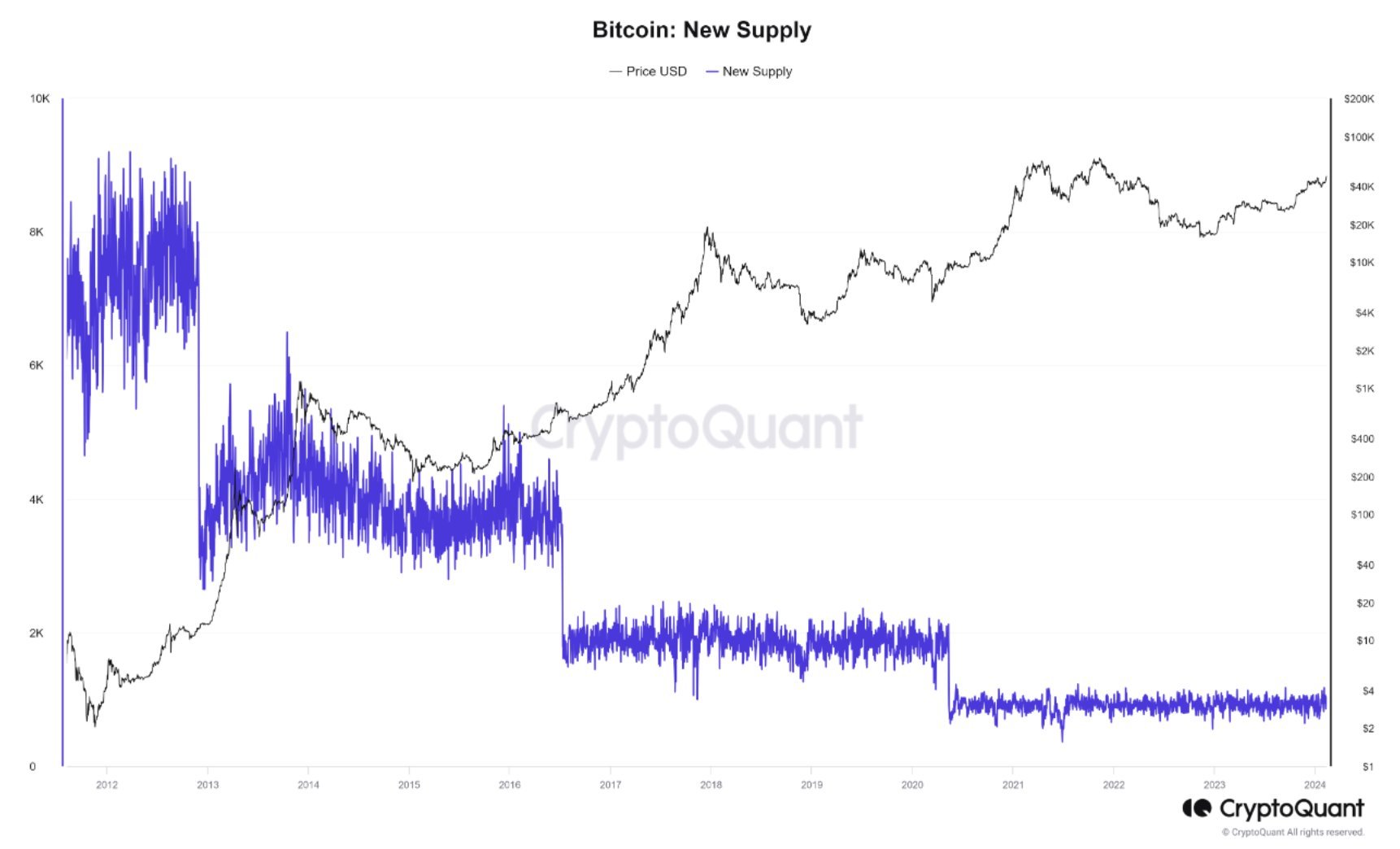Oferta de Bitcoin scade cu fiecare eveniment de halving. În plus, crearea de ETF-uri a crescut cererea pe termen mediu și lung pentru criptomonedă. Următorul astfel de eveniment va avea loc în luna aprilie a acestui an. Sursa: CryptoQuant