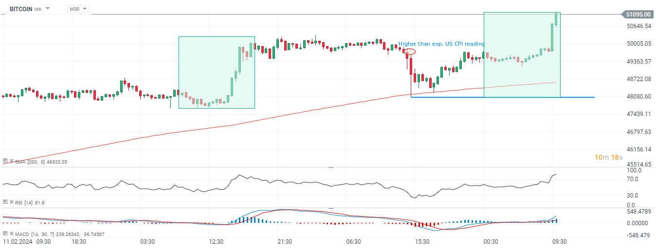 Bitcoin a reușit să își revină rapid și, după prăbușirea de ieri la 48.000 de dolari, cauzată de datele CPI din SUA ușor mai mari decât se preconiza, se tranzacționează la noi maxime locale, la 51.500 de dolari. Forța dolarului american nu a împiedicat Bitcoin să urce de la 48.000 de dolari, la peste 51.000 de dolari, în doar câteva ore. Ethereum este la fel de bine dispus, apropiindu-se de 2.700 de dolari, un nivel care nu a mai fost văzut din mai 2022. Mai mult de 94% dintre portofelele Bitcoin sunt pe profit, ceea ce este în mod istoric în concordanță cu impulsul pieței de creștere.