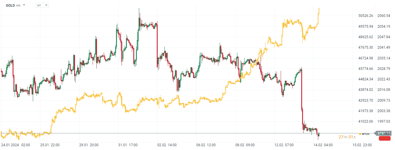 Aurul a înregistrat ieri un declin puternic. Bitcoin (graficul aurului), în schimb, a reușit să inverseze foarte repede reacția ofertei. Sursa: xStation5