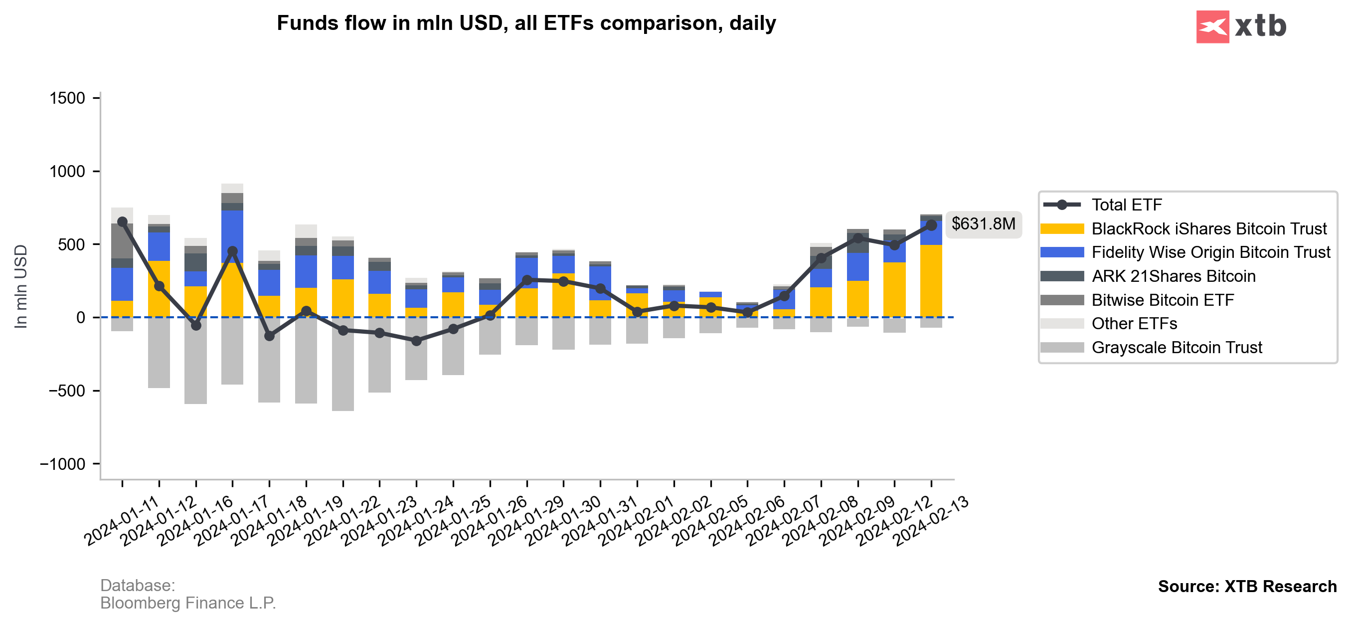 Ultimele zile au adus o activitate mai mare a investitorilor în ETF-urile de bitcoin. Valoarea intrărilor zilnice se situează în jurul valorii de 600 de milioane de dolari, în condițiile în care ieșirile de la Grayscale sunt în mod constant mai mici. Sursa: Bloomberg Finance L.P.