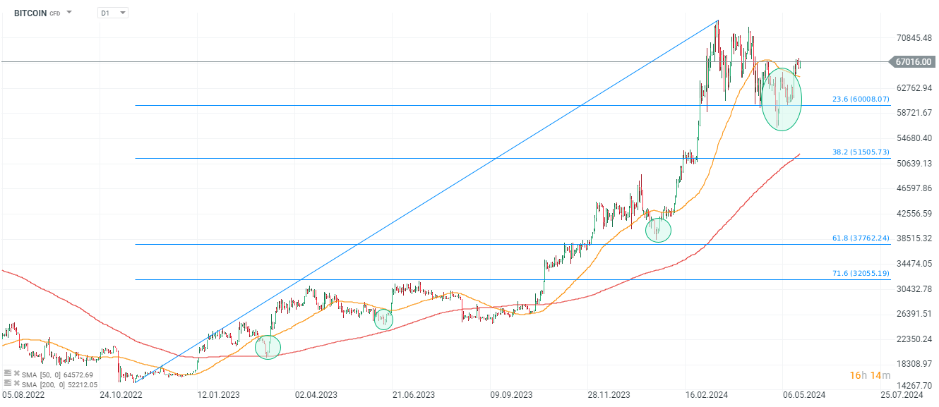Putem observa că declinul din aprilie până la 56.000 de dolari s-a încheiat cu o revenire în formă de V, iar prețul a depășit media mobilă simplă de 50 de ședințe (linia portocalie). Momentul pare să-i "favorizeze" din nou pe tauri. Relansările anterioare în formă de V au produs câștiguri considerabile, dar, în ciuda acestui lucru, nu este niciodată un scenariu garantat.