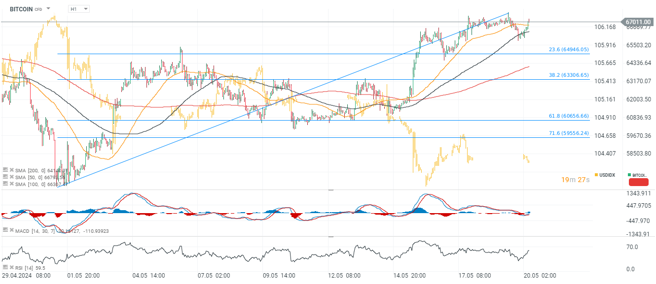 - Săptămâna aceasta va aduce probabil un test al impulsului ascendent pentru Bitcoin. Pe 22 mai, după ședință, Nvidia va raporta rezultatele, iar o serie de membri ai Fed vor lua cuvântul, comentând recentele citiri ale inflației care au mulțumit Wall Street, în ciuda imaginii încă "pro inflaționiste" a serviciilor și a altor indicatori de preț.