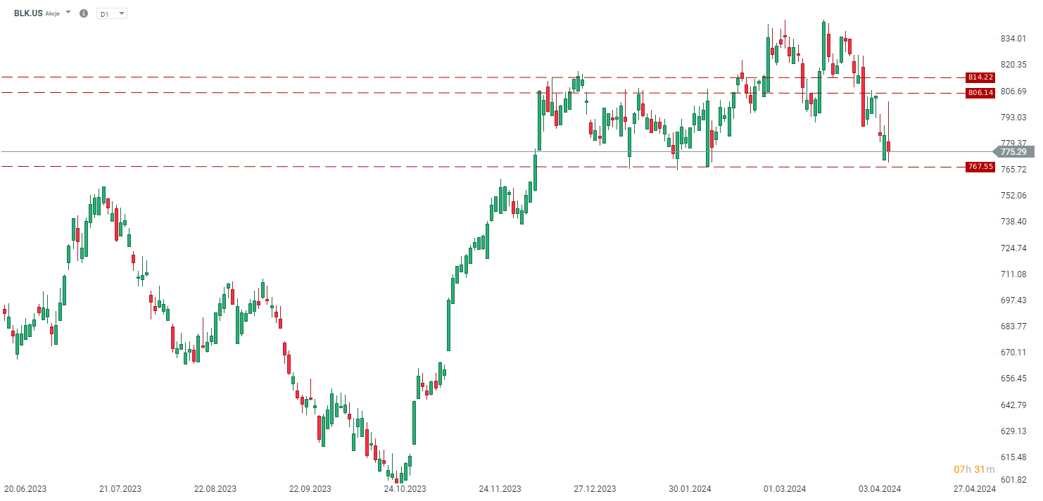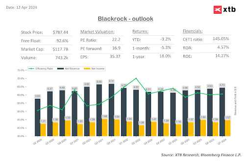 BlackRock a raportat rezultate în Q1 2024 mai mari decât consensul pieței. Compania a înregistrat un record de AUM (active sub administrare), care la sfârșitul trimestrului se ridicau la 10.470 de miliarde de dolari (+15% de la an la an). Media AUM pentru trimestru a fost de 10.180 de miliarde de dolari, în creștere cu 14% de la an la an. Veniturile au depășit așteptările pieței cu 1,06%, profitul diluat pe acțiune a fost cu 5,04% mai mare decât consensul, iar valoarea AUM a depășit așteptările cu +0,37%.