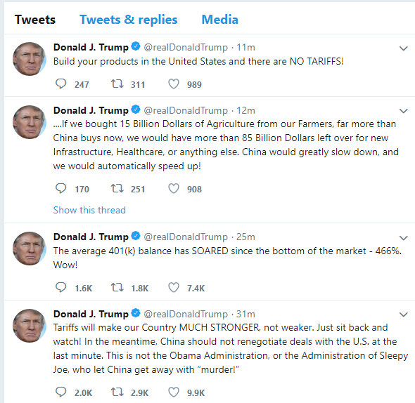 Mai puternic decât setul de date macro sau comentariile uzuale din prima pagină a agențiilor de știri, contul de Twitter al președintelui SUA a modulat răspunsul piețelor în orele de dinaintea sesiunii SUA. La câteva ore după ce China a amenințat cu riposta la majorarea taxelor vamale, președintele SUA a încurajat firmele să producă în SUA, unde nu sunt taxe vamale, și a semnalat că în urma sancțiunilor SUA ar deveni mai puternice. În plus, într-o poziționare care pare a arăta detașarea față de fluctuațiile pe termen scurt, a vorbit despre avansul de 466% de la minimul pieței (în 2009): mutarea orizontului pe un parcurs al mai multor ani ar putea inspira ideea că o corecție ar putea fi suportată. US500 a scăzut, ajungând chiar să testeze un suport important. Revenirea ulterioară a generat un tipar ”hammer”, care uneori, în teoria lumânărilor japoneze, poate indica revenire pe termen scurt. Într-o astfel de sesiune, totuși, emoțiile, chiar cu un minim ghidaj oficial, pot domina influențele tehnice, și chiar ale datelor fundamentale: inflația pentru consumatori a atins 2%, sub estimare, cu un efect relativ limitat pe burse, în timp ce dolarul a pierdut puțin peste 0.1% în 30 de minute. Pentru moment, atmosfera nu este, dincolo de semnalul tehnic, foarte relaxată.