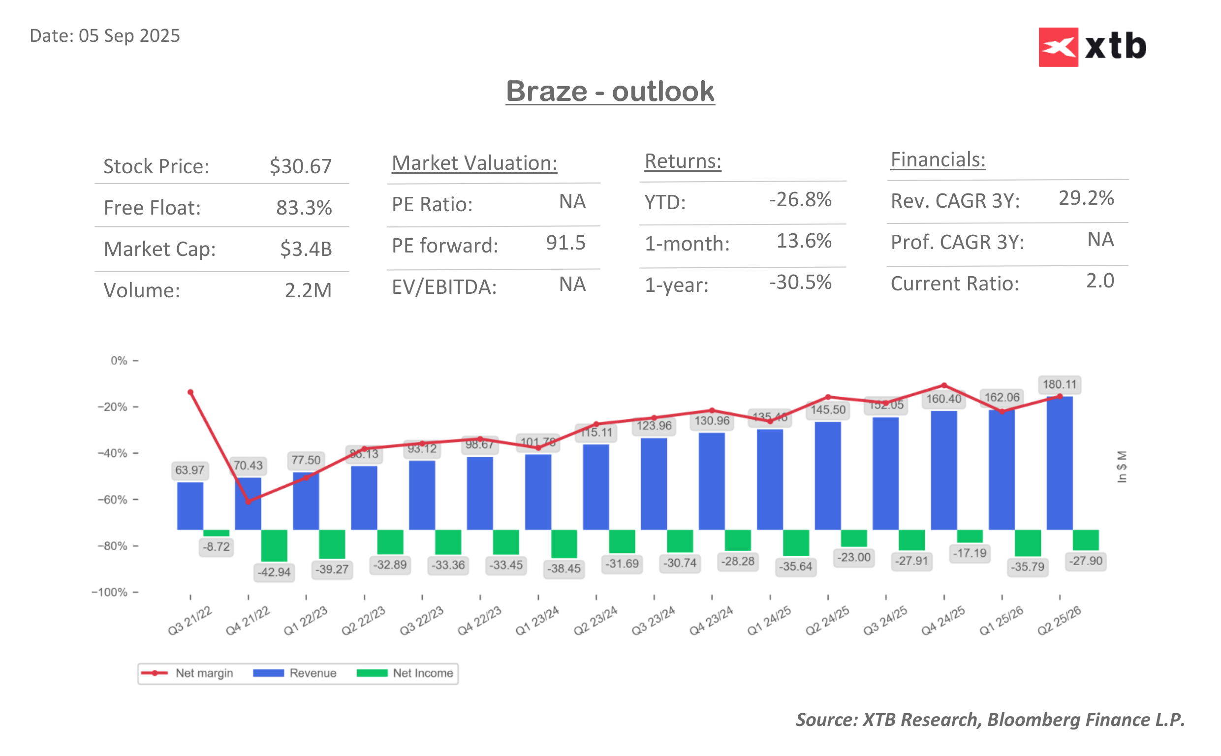 Braze (BRZE.US) a înregistrat o creștere de până la 19% înainte de deschiderea sesiunii, după rezultate financiare solide în trimestrul al doilea și previziuni mai bune decât se aștepta pentru trimestrul al treilea. Cu toate acestea, în timpul sesiunii, câștigurile s-au redus la 12%. Conducerea a subliniat sprijinul oferit de personalizarea bazată pe inteligența artificială și tendința datelor primare. Compania a surprins în mod pozitiv și prin reînnoirea contractelor și îmbunătățirea conversiei tranzacțiilor mari.