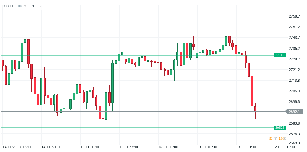 NAHB a scăzut semnificativ, atingând cel mai coborât nivel al ultimilor 2 ani, 60, cu toate că investitorii au găsit, în deschiderea sesiunii din SUA, și alte motive de prudență: întâlnirea SUA-China a diminuat, nu susținut, speranțele unui acord comercial (unele comentarii ale vicepreședintelui au fost critice la adresa asumării de datorie de către state finanțate de China), Apple a scăzut, presând indicii prin ponderea importantă în capitalizarea Nasdaq și S&P500 (este pe locul 1) în urma estimărilor de producție în scădere pentru iPhone, potrivit WSJ. În plus, Goldman Sachs a anunțat estimări în scădere pentru avansul PIB-ului în SUA, de la 2.5% în T1 2019 la 1.6% în ultimul trimestru. Lipsa de opoziție a cumpărătorilor pe parcursul descendent al primelor 3 ore de tranzacționare atestă, totuși, un grad ridicat de îngrijorare. Desele schimbări de comunicare în privința relațiilor comerciale cu China ar putea fi o sursă de ”oboseală”, inducând o primă de risc suplimentară în piață. După scăderi importante, de peste 1.5%, US500 s-a apropiat de suportul de la 2680.8 puncte, sub care se regăsește un minim anterior la 2670.8. Rezistența ar putea fi dată de minimul de vineri, 2708.3 puncte.