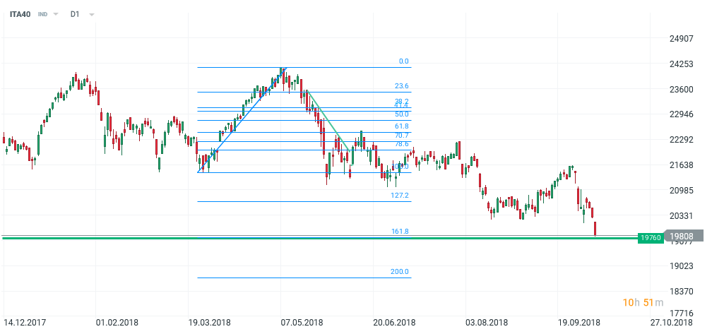 Weekend-ul nu a liniștit temerile investitorilor. DAX a ajuns sub 12 000 pe futures, iar bursa italiană (indicele FTSE MIB) a pierdut peste 2% la ora 14. Graficul ITA40 reprezintă un contract CFD pe futures pe piața italiană. În fața nemulțumirilor tot mai puțin voalate ale oficialilor europeni, guvernul italian afirmă că merge înainte cu propunerile de buget care adâncesc deficitul la 2.4% anul, viitor, de 3 ori mai mari față de așteptările anterioare, și asta în condițiile în care creșterea economică nu ar fi sub previziunile de creștere relativ optimiste. Titlurile de stat au scăzut, ducând randamentele pe 10 ani aproape de 3.6%, niveluri întâlnite abia în 2014, dar, totuși, mult sub zona 5-7% din perioada crizei datoriilor suverane din zona Euro, în 2011 și 2012. Tonul dialogului între UE și Italia e, însă, o sursă de îngrijorare. Sunt doar câteva ore de când Matteo Salvini, vicepremier, a afirmat că adevărații adversari ai Europei sunt Juncker și birocrația de la Bruxelles care impune restricții bugetare și granție deschise, adăugând că austeritatea a ”sărăcit” Italia. Pentru moment, suportul din zona 19800 de puncte (zonă de rezistență în 2 rânduri în ianuarie 2017, și 161.8% din secvența pozitivă între martie și mai anul acesta) este o barieră importantă, cel puțin intra-day. Dacă investitorii nu vor întrevedea o șansă de dialog, însă, riscul continuării parcursului ascendent al dobânzilor este de luat cu mare atenție în calcul, iar efectele indirecte ar putea fi o presiune suplimentaăr în piața bursieră locală.
