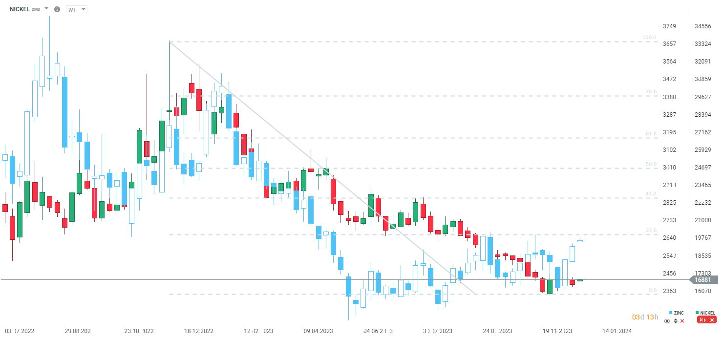 În timp ce anul 2022 a fost tumultuos pe piața nichelului ca urmare a agresiunii Rusiei în Ucraina și a incertitudinilor din China, materia primă a urmat o traiectorie descendentă pe parcursul anului 2023. În cele din urmă, s-a dovedit că nu au existat probleme de acces la aprovizionare în Rusia și, în plus, producția din Indonezia a crescut cu peste 30% în prima jumătate a anului. În plus, cererea mai mică din partea sectorului vehiculelor electrice a dus la un surplus de ofertă. Se preconizează o continuare a surplusului de ofertă în anul următor, iar din 2025 se anticipează o creștere a cererii, tocmai datorită sectorului vehiculelor electrice. Anul viitor, se estimează că oferta excedentară va fi de 240.000 de tone. Cu toate acestea, o corelație semnificativă cu zincul poate sugera că scăderea prețului la minimele din 2021 a fost excesivă.