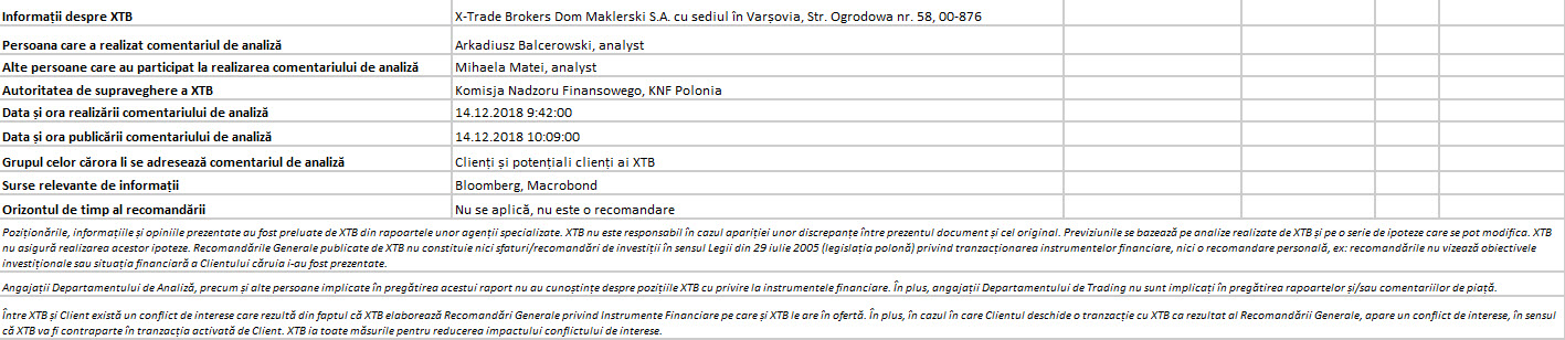 "Acest material este o comunicare de marketing în sensul articolului 24 alineatul (3) din Directiva 2014/65 / UE a Parlamentului European și a Consiliului din 15 mai 2014 privind piețele de instrumente financiare, și de modificare a Directivei 2002/92 / CE și a Directivei 2011 / 61 / UE (MiFID II). Comunicarea de marketing nu este o recomandare de investiții sau o recomandare de informații sau o recomandare care sugerează o strategie de investiții în sensul Regulamentului (UE) nr. 596/2014 al Parlamentului European și al Consiliului din 16 aprilie 2014 privind abuzul de piață ( reglementarea abuzului de piață) și de abrogare a Directivei 2003/6 / CE a Parlamentului European și a Consiliului și a Directivelor Comisiei 2003/124 / CE, 2003/125 / CE și 2004/72 / CE și a Regulamentului delegat (UE) 2016/958 al Comisiei din 9 596/2014 al Parlamentului European și al Consiliului în ceea ce privește standardele tehnice de reglementare pentru aranjamentele tehnice pentru prezentarea obiectivă a recomandărilor de investiții sau a altor informații care sugerează strategii de investiții și pentru dezvăluirea de interese particulare sau indicații de conflicte de interese sau orice alte sfaturi, inclusiv în domeniul consultanței în materie de investiții, în sensul Legii privind tranzacționarea cu instrumente financiare din 29 iulie 2005 (de ex. Journal of Laws 2019, articolul 875, astfel cum a fost modificat). Comunicarea de marketing este pregătită cu cea mai mare diligență, obiectivitate, prezintă faptele cunoscute autorului la data pregătirii și este lipsită de orice elemente de evaluare. Comunicarea de marketing este pregătită fără a lua în considerare nevoile clientului, situația sa financiară individuală și nu prezintă nicio strategie de investiții în niciun fel. Comunicarea de marketing nu constituie o ofertă de vânzare, oferire, abonament, invitație la cumpărare, reclamă sau promovare a oricărui instrument financiar. XTB SA nu este responsabilă pentru acțiunile sau omisiunile niciunui client, în special pentru achiziționarea sau cedarea instrumente, întreprinse pe baza informațiilor conținute în această comunicare de marketing. XTB SA nu va accepta răspunderea pentru nicio pierdere sau daună, inclusiv, fără limitare, orice pierdere care poate apărea direct sau indirect, efectuată pe baza informațiilor conținute în această comunicare de marketing. În cazul în care comunicarea de marketing conține informații despre orice rezultat cu privire la instrumentele financiare indicate în acestea, acestea nu constituie nicio garanție sau prognoză cu privire la rezultatele viitoare. Performanțele anterioare nu indică neapărat rezultatele viitoare și orice persoană care acționează pe baza acestor informații o face pe propriul risc. Acest material nu este emis pentru a influenta deciziile de tranzacționare ale niciunei persoane. Informațiile cuprinse în cadrul acestui material nu sunt prezentate pentru a fi aplicate, copiate sau testate în cadrul tranzacțiilor dumneavoastră. Informațiile cuprinse în cadrul acestui material sunt emise în baza experienței proprii a emitentului și nu reprezintă o recomandare individuală, nu vizează atingerea anumitor obiective, randamente financiare și nu se adresează nevoilor niciunei persoane anume care ar primi-o. Premisele acestui material nu au în vedere situația și persoana dumneavoastră deci nu recomandăm utilizarea acestor informații sub orice formă. Utilizarea informațiilor cuprinse în cadrul acestui material în orice modalitate se face pe propria dumneavoastră răspundere. Acest material este emis de către un analist pentru care își asumă răspunderea XTB SA, persoană juridică autorizată de KNF – Autoritatea de Supraveghere Financiara din Polonia."