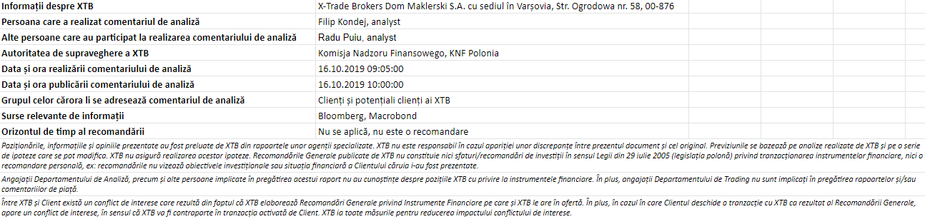 "Acest material este o comunicare de marketing în sensul articolului 24 alineatul (3) din Directiva 2014/65 / UE a Parlamentului European și a Consiliului din 15 mai 2014 privind piețele de instrumente financiare, și de modificare a Directivei 2002/92 / CE și a Directivei 2011 / 61 / UE (MiFID II). Comunicarea de marketing nu este o recomandare de investiții sau o recomandare de informații sau o recomandare care sugerează o strategie de investiții în sensul Regulamentului (UE) nr. 596/2014 al Parlamentului European și al Consiliului din 16 aprilie 2014 privind abuzul de piață ( reglementarea abuzului de piață) și de abrogare a Directivei 2003/6 / CE a Parlamentului European și a Consiliului și a Directivelor Comisiei 2003/124 / CE, 2003/125 / CE și 2004/72 / CE și a Regulamentului delegat (UE) 2016/958 al Comisiei din 9 596/2014 al Parlamentului European și al Consiliului în ceea ce privește standardele tehnice de reglementare pentru aranjamentele tehnice pentru prezentarea obiectivă a recomandărilor de investiții sau a altor informații care sugerează strategii de investiții și pentru dezvăluirea de interese particulare sau indicații de conflicte de interese sau orice alte sfaturi, inclusiv în domeniul consultanței în materie de investiții, în sensul Legii privind tranzacționarea cu instrumente financiare din 29 iulie 2005 (de ex. Journal of Laws 2019, articolul 875, astfel cum a fost modificat). Comunicarea de marketing este pregătită cu cea mai mare diligență, obiectivitate, prezintă faptele cunoscute autorului la data pregătirii și este lipsită de orice elemente de evaluare. Comunicarea de marketing este pregătită fără a lua în considerare nevoile clientului, situația sa financiară individuală și nu prezintă nicio strategie de investiții în niciun fel. Comunicarea de marketing nu constituie o ofertă de vânzare, oferire, abonament, invitație la cumpărare, reclamă sau promovare a oricărui instrument financiar. XTB SA nu este responsabilă pentru acțiunile sau omisiunile niciunui client, în special pentru achiziționarea sau cedarea instrumente, întreprinse pe baza informațiilor conținute în această comunicare de marketing. XTB SA nu va accepta răspunderea pentru nicio pierdere sau daună, inclusiv, fără limitare, orice pierdere care poate apărea direct sau indirect, efectuată pe baza informațiilor conținute în această comunicare de marketing. În cazul în care comunicarea de marketing conține informații despre orice rezultat cu privire la instrumentele financiare indicate în acestea, acestea nu constituie nicio garanție sau prognoză cu privire la rezultatele viitoare. Performanțele anterioare nu indică neapărat rezultatele viitoare și orice persoană care acționează pe baza acestor informații o face pe propriul risc. Acest material nu este emis pentru a influenta deciziile de tranzacționare ale niciunei persoane. Informațiile cuprinse în cadrul acestui material nu sunt prezentate pentru a fi aplicate, copiate sau testate în cadrul tranzacțiilor dumneavoastră. Informațiile cuprinse în cadrul acestui material sunt emise în baza experienței proprii a emitentului și nu reprezintă o recomandare individuală, nu vizează atingerea anumitor obiective, randamente financiare și nu se adresează nevoilor niciunei persoane anume care ar primi-o. Premisele acestui material nu au în vedere situația și persoana dumneavoastră deci nu recomandăm utilizarea acestor informații sub orice formă. Utilizarea informațiilor cuprinse în cadrul acestui material în orice modalitate se face pe propria dumneavoastră răspundere. Acest material este emis de către un analist pentru care își asumă răspunderea XTB SA, persoană juridică autorizată de KNF – Autoritatea de Supraveghere Financiara din Polonia."