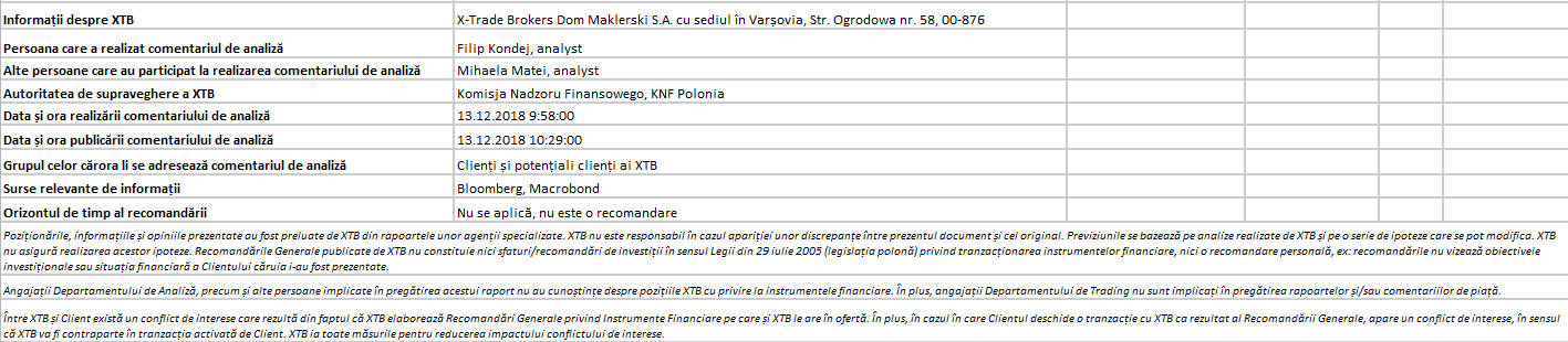 "Acest material este o comunicare de marketing în sensul articolului 24 alineatul (3) din Directiva 2014/65 / UE a Parlamentului European și a Consiliului din 15 mai 2014 privind piețele de instrumente financiare, și de modificare a Directivei 2002/92 / CE și a Directivei 2011 / 61 / UE (MiFID II). Comunicarea de marketing nu este o recomandare de investiții sau o recomandare de informații sau o recomandare care sugerează o strategie de investiții în sensul Regulamentului (UE) nr. 596/2014 al Parlamentului European și al Consiliului din 16 aprilie 2014 privind abuzul de piață ( reglementarea abuzului de piață) și de abrogare a Directivei 2003/6 / CE a Parlamentului European și a Consiliului și a Directivelor Comisiei 2003/124 / CE, 2003/125 / CE și 2004/72 / CE și a Regulamentului delegat (UE) 2016/958 al Comisiei din 9 596/2014 al Parlamentului European și al Consiliului în ceea ce privește standardele tehnice de reglementare pentru aranjamentele tehnice pentru prezentarea obiectivă a recomandărilor de investiții sau a altor informații care sugerează strategii de investiții și pentru dezvăluirea de interese particulare sau indicații de conflicte de interese sau orice alte sfaturi, inclusiv în domeniul consultanței în materie de investiții, în sensul Legii privind tranzacționarea cu instrumente financiare din 29 iulie 2005 (de ex. Journal of Laws 2019, articolul 875, astfel cum a fost modificat). Comunicarea de marketing este pregătită cu cea mai mare diligență, obiectivitate, prezintă faptele cunoscute autorului la data pregătirii și este lipsită de orice elemente de evaluare. Comunicarea de marketing este pregătită fără a lua în considerare nevoile clientului, situația sa financiară individuală și nu prezintă nicio strategie de investiții în niciun fel. Comunicarea de marketing nu constituie o ofertă de vânzare, oferire, abonament, invitație la cumpărare, reclamă sau promovare a oricărui instrument financiar. XTB SA nu este responsabilă pentru acțiunile sau omisiunile niciunui client, în special pentru achiziționarea sau cedarea instrumente, întreprinse pe baza informațiilor conținute în această comunicare de marketing. XTB SA nu va accepta răspunderea pentru nicio pierdere sau daună, inclusiv, fără limitare, orice pierdere care poate apărea direct sau indirect, efectuată pe baza informațiilor conținute în această comunicare de marketing. În cazul în care comunicarea de marketing conține informații despre orice rezultat cu privire la instrumentele financiare indicate în acestea, acestea nu constituie nicio garanție sau prognoză cu privire la rezultatele viitoare. Performanțele anterioare nu indică neapărat rezultatele viitoare și orice persoană care acționează pe baza acestor informații o face pe propriul risc. Acest material nu este emis pentru a influenta deciziile de tranzacționare ale niciunei persoane. Informațiile cuprinse în cadrul acestui material nu sunt prezentate pentru a fi aplicate, copiate sau testate în cadrul tranzacțiilor dumneavoastră. Informațiile cuprinse în cadrul acestui material sunt emise în baza experienței proprii a emitentului și nu reprezintă o recomandare individuală, nu vizează atingerea anumitor obiective, randamente financiare și nu se adresează nevoilor niciunei persoane anume care ar primi-o. Premisele acestui material nu au în vedere situația și persoana dumneavoastră deci nu recomandăm utilizarea acestor informații sub orice formă. Utilizarea informațiilor cuprinse în cadrul acestui material în orice modalitate se face pe propria dumneavoastră răspundere. Acest material este emis de către un analist pentru care își asumă răspunderea XTB SA, persoană juridică autorizată de KNF – Autoritatea de Supraveghere Financiara din Polonia."