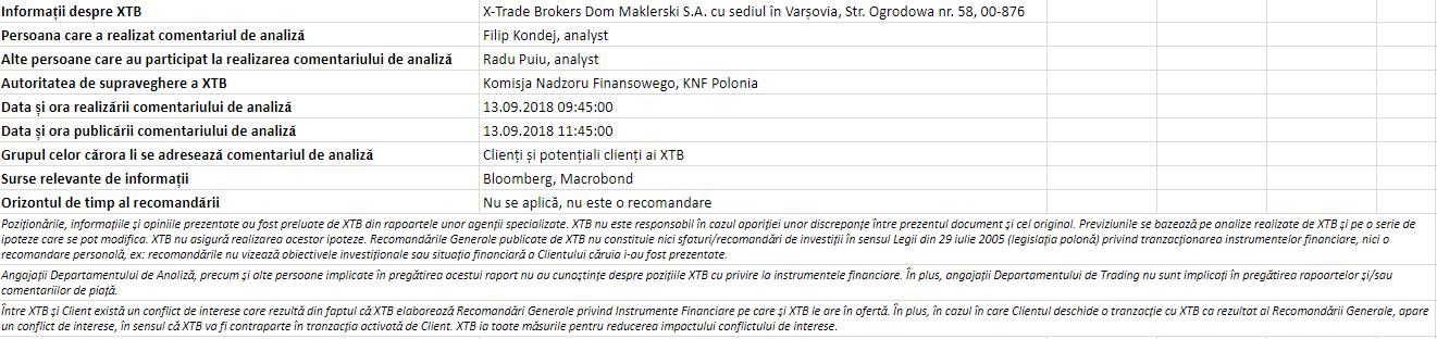 "Acest material este o comunicare de marketing în sensul articolului 24 alineatul (3) din Directiva 2014/65 / UE a Parlamentului European și a Consiliului din 15 mai 2014 privind piețele de instrumente financiare, și de modificare a Directivei 2002/92 / CE și a Directivei 2011 / 61 / UE (MiFID II). Comunicarea de marketing nu este o recomandare de investiții sau o recomandare de informații sau o recomandare care sugerează o strategie de investiții în sensul Regulamentului (UE) nr. 596/2014 al Parlamentului European și al Consiliului din 16 aprilie 2014 privind abuzul de piață ( reglementarea abuzului de piață) și de abrogare a Directivei 2003/6 / CE a Parlamentului European și a Consiliului și a Directivelor Comisiei 2003/124 / CE, 2003/125 / CE și 2004/72 / CE și a Regulamentului delegat (UE) 2016/958 al Comisiei din 9 596/2014 al Parlamentului European și al Consiliului în ceea ce privește standardele tehnice de reglementare pentru aranjamentele tehnice pentru prezentarea obiectivă a recomandărilor de investiții sau a altor informații care sugerează strategii de investiții și pentru dezvăluirea de interese particulare sau indicații de conflicte de interese sau orice alte sfaturi, inclusiv în domeniul consultanței în materie de investiții, în sensul Legii privind tranzacționarea cu instrumente financiare din 29 iulie 2005 (de ex. Journal of Laws 2019, articolul 875, astfel cum a fost modificat). Comunicarea de marketing este pregătită cu cea mai mare diligență, obiectivitate, prezintă faptele cunoscute autorului la data pregătirii și este lipsită de orice elemente de evaluare. Comunicarea de marketing este pregătită fără a lua în considerare nevoile clientului, situația sa financiară individuală și nu prezintă nicio strategie de investiții în niciun fel. Comunicarea de marketing nu constituie o ofertă de vânzare, oferire, abonament, invitație la cumpărare, reclamă sau promovare a oricărui instrument financiar. XTB SA nu este responsabilă pentru acțiunile sau omisiunile niciunui client, în special pentru achiziționarea sau cedarea instrumente, întreprinse pe baza informațiilor conținute în această comunicare de marketing. XTB SA nu va accepta răspunderea pentru nicio pierdere sau daună, inclusiv, fără limitare, orice pierdere care poate apărea direct sau indirect, efectuată pe baza informațiilor conținute în această comunicare de marketing. În cazul în care comunicarea de marketing conține informații despre orice rezultat cu privire la instrumentele financiare indicate în acestea, acestea nu constituie nicio garanție sau prognoză cu privire la rezultatele viitoare. Performanțele anterioare nu indică neapărat rezultatele viitoare și orice persoană care acționează pe baza acestor informații o face pe propriul risc. Acest material nu este emis pentru a influenta deciziile de tranzacționare ale niciunei persoane. Informațiile cuprinse în cadrul acestui material nu sunt prezentate pentru a fi aplicate, copiate sau testate în cadrul tranzacțiilor dumneavoastră. Informațiile cuprinse în cadrul acestui material sunt emise în baza experienței proprii a emitentului și nu reprezintă o recomandare individuală, nu vizează atingerea anumitor obiective, randamente financiare și nu se adresează nevoilor niciunei persoane anume care ar primi-o. Premisele acestui material nu au în vedere situația și persoana dumneavoastră deci nu recomandăm utilizarea acestor informații sub orice formă. Utilizarea informațiilor cuprinse în cadrul acestui material în orice modalitate se face pe propria dumneavoastră răspundere. Acest material este emis de către un analist pentru care își asumă răspunderea XTB SA, persoană juridică autorizată de KNF – Autoritatea de Supraveghere Financiara din Polonia."