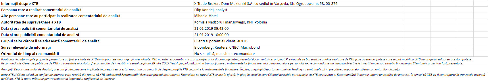 "Acest material este o comunicare de marketing în sensul articolului 24 alineatul (3) din Directiva 2014/65 / UE a Parlamentului European și a Consiliului din 15 mai 2014 privind piețele de instrumente financiare, și de modificare a Directivei 2002/92 / CE și a Directivei 2011 / 61 / UE (MiFID II). Comunicarea de marketing nu este o recomandare de investiții sau o recomandare de informații sau o recomandare care sugerează o strategie de investiții în sensul Regulamentului (UE) nr. 596/2014 al Parlamentului European și al Consiliului din 16 aprilie 2014 privind abuzul de piață ( reglementarea abuzului de piață) și de abrogare a Directivei 2003/6 / CE a Parlamentului European și a Consiliului și a Directivelor Comisiei 2003/124 / CE, 2003/125 / CE și 2004/72 / CE și a Regulamentului delegat (UE) 2016/958 al Comisiei din 9 596/2014 al Parlamentului European și al Consiliului în ceea ce privește standardele tehnice de reglementare pentru aranjamentele tehnice pentru prezentarea obiectivă a recomandărilor de investiții sau a altor informații care sugerează strategii de investiții și pentru dezvăluirea de interese particulare sau indicații de conflicte de interese sau orice alte sfaturi, inclusiv în domeniul consultanței în materie de investiții, în sensul Legii privind tranzacționarea cu instrumente financiare din 29 iulie 2005 (de ex. Journal of Laws 2019, articolul 875, astfel cum a fost modificat). Comunicarea de marketing este pregătită cu cea mai mare diligență, obiectivitate, prezintă faptele cunoscute autorului la data pregătirii și este lipsită de orice elemente de evaluare. Comunicarea de marketing este pregătită fără a lua în considerare nevoile clientului, situația sa financiară individuală și nu prezintă nicio strategie de investiții în niciun fel. Comunicarea de marketing nu constituie o ofertă de vânzare, oferire, abonament, invitație la cumpărare, reclamă sau promovare a oricărui instrument financiar. XTB SA nu este responsabilă pentru acțiunile sau omisiunile niciunui client, în special pentru achiziționarea sau cedarea instrumente, întreprinse pe baza informațiilor conținute în această comunicare de marketing. XTB SA nu va accepta răspunderea pentru nicio pierdere sau daună, inclusiv, fără limitare, orice pierdere care poate apărea direct sau indirect, efectuată pe baza informațiilor conținute în această comunicare de marketing. În cazul în care comunicarea de marketing conține informații despre orice rezultat cu privire la instrumentele financiare indicate în acestea, acestea nu constituie nicio garanție sau prognoză cu privire la rezultatele viitoare. Performanțele anterioare nu indică neapărat rezultatele viitoare și orice persoană care acționează pe baza acestor informații o face pe propriul risc. Acest material nu este emis pentru a influenta deciziile de tranzacționare ale niciunei persoane. Informațiile cuprinse în cadrul acestui material nu sunt prezentate pentru a fi aplicate, copiate sau testate în cadrul tranzacțiilor dumneavoastră. Informațiile cuprinse în cadrul acestui material sunt emise în baza experienței proprii a emitentului și nu reprezintă o recomandare individuală, nu vizează atingerea anumitor obiective, randamente financiare și nu se adresează nevoilor niciunei persoane anume care ar primi-o. Premisele acestui material nu au în vedere situația și persoana dumneavoastră deci nu recomandăm utilizarea acestor informații sub orice formă. Utilizarea informațiilor cuprinse în cadrul acestui material în orice modalitate se face pe propria dumneavoastră răspundere. Acest material este emis de către un analist pentru care își asumă răspunderea XTB SA, persoană juridică autorizată de KNF – Autoritatea de Supraveghere Financiara din Polonia."